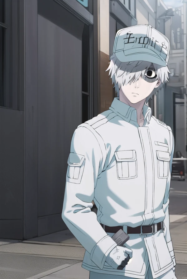 white blood cell, long sleeves, white hair, male focus, (hair over one eye:1.5), colored skin, white skin, (black eyes:1.5),