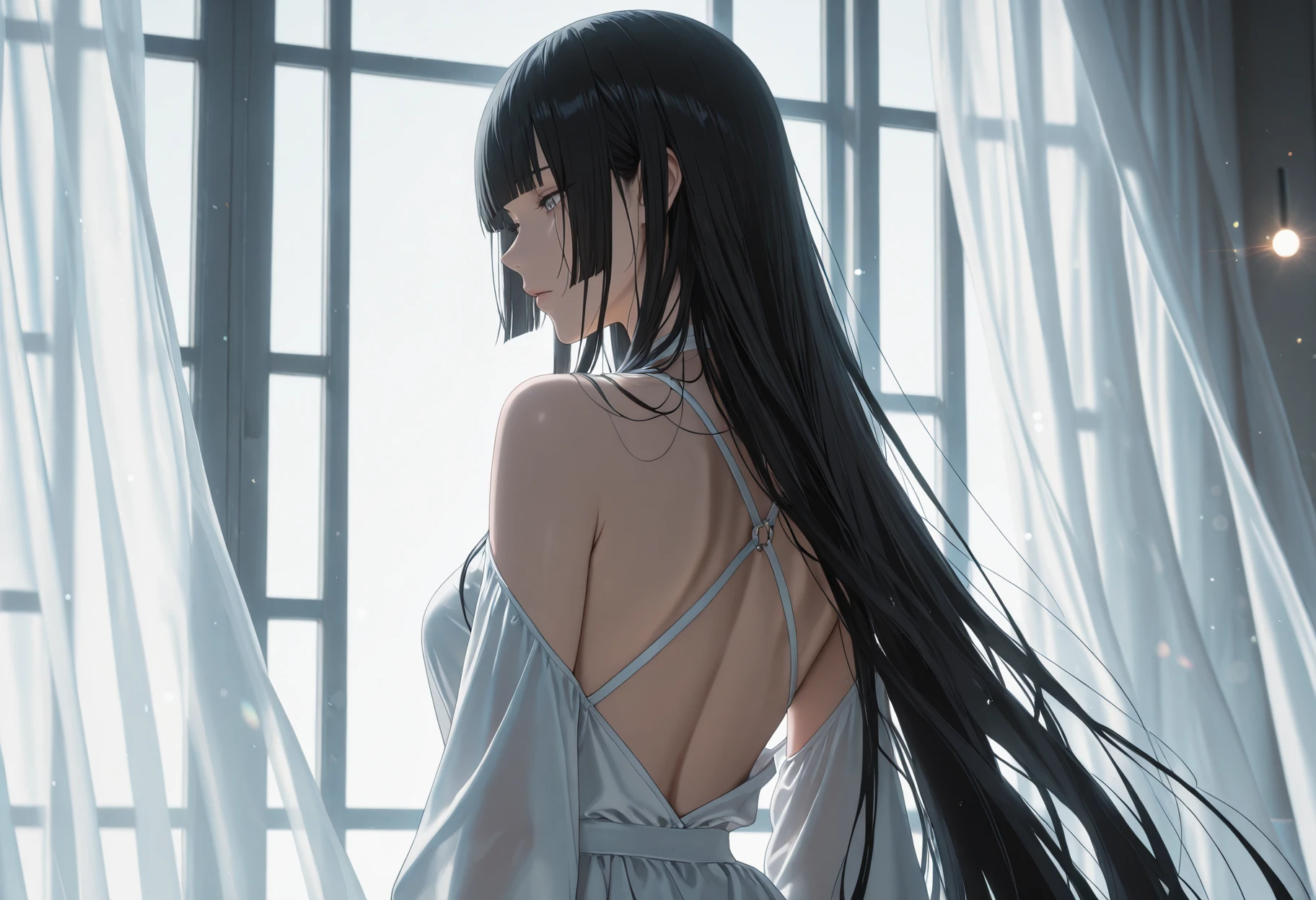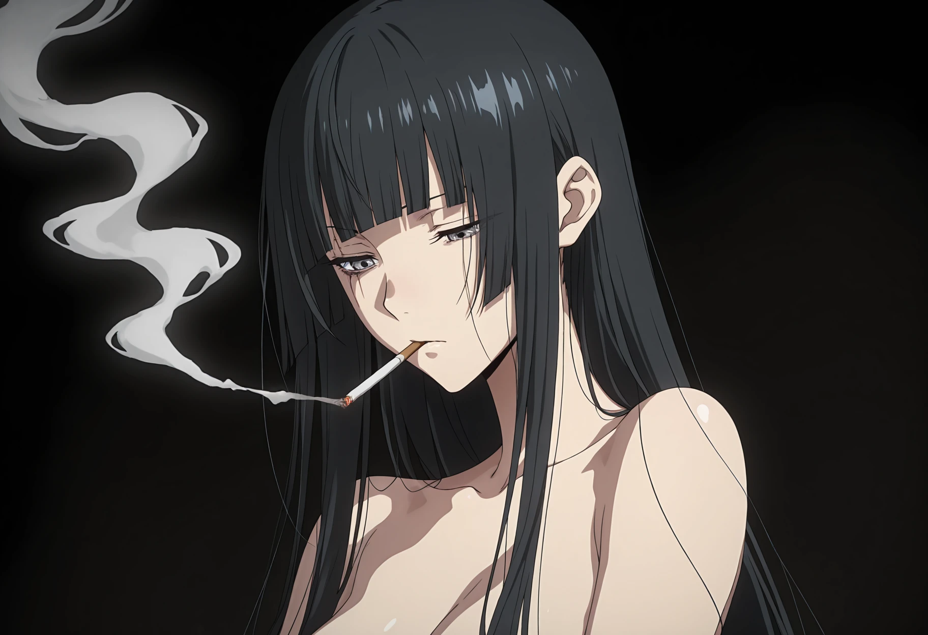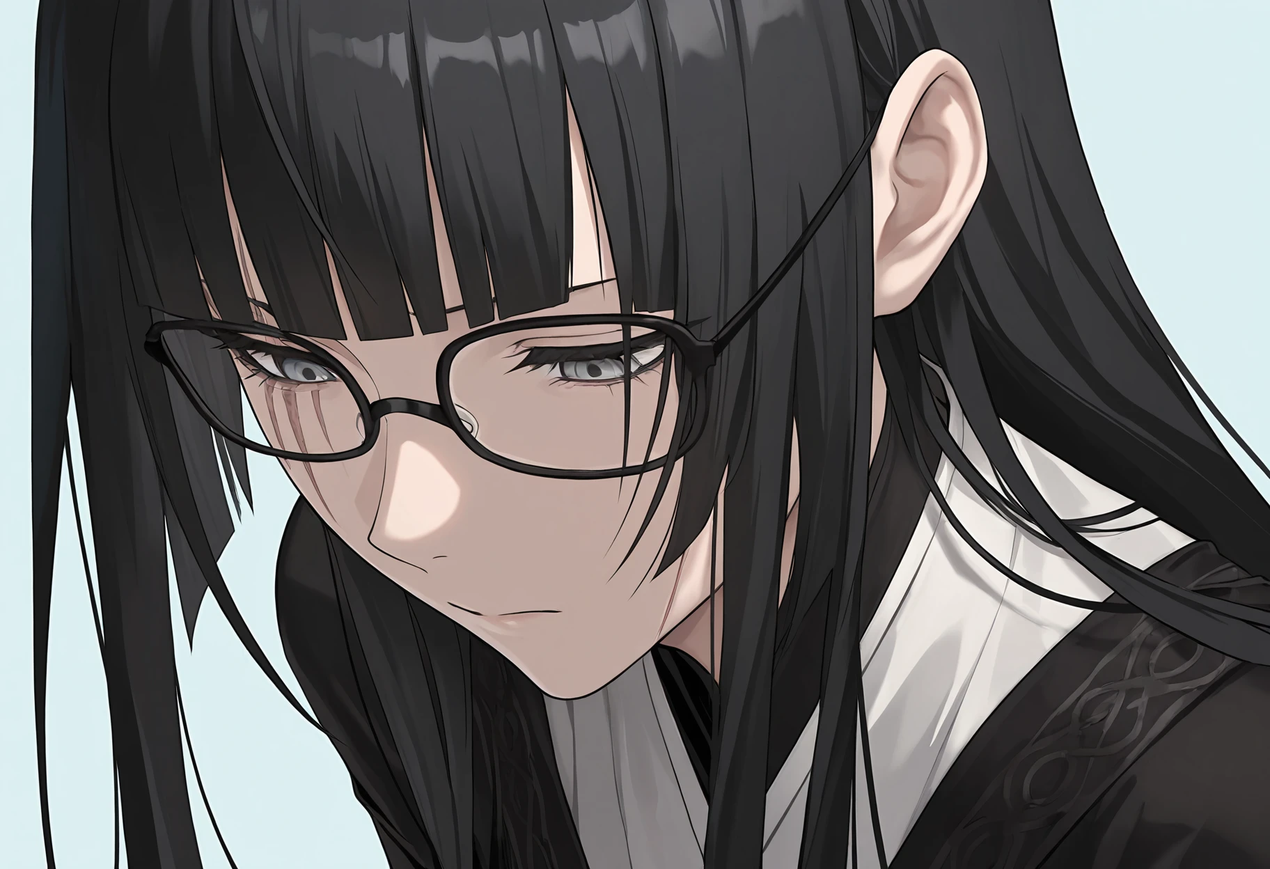 Tags标签标签: black hair,grey eyes,very long hair,blunt bangs,
