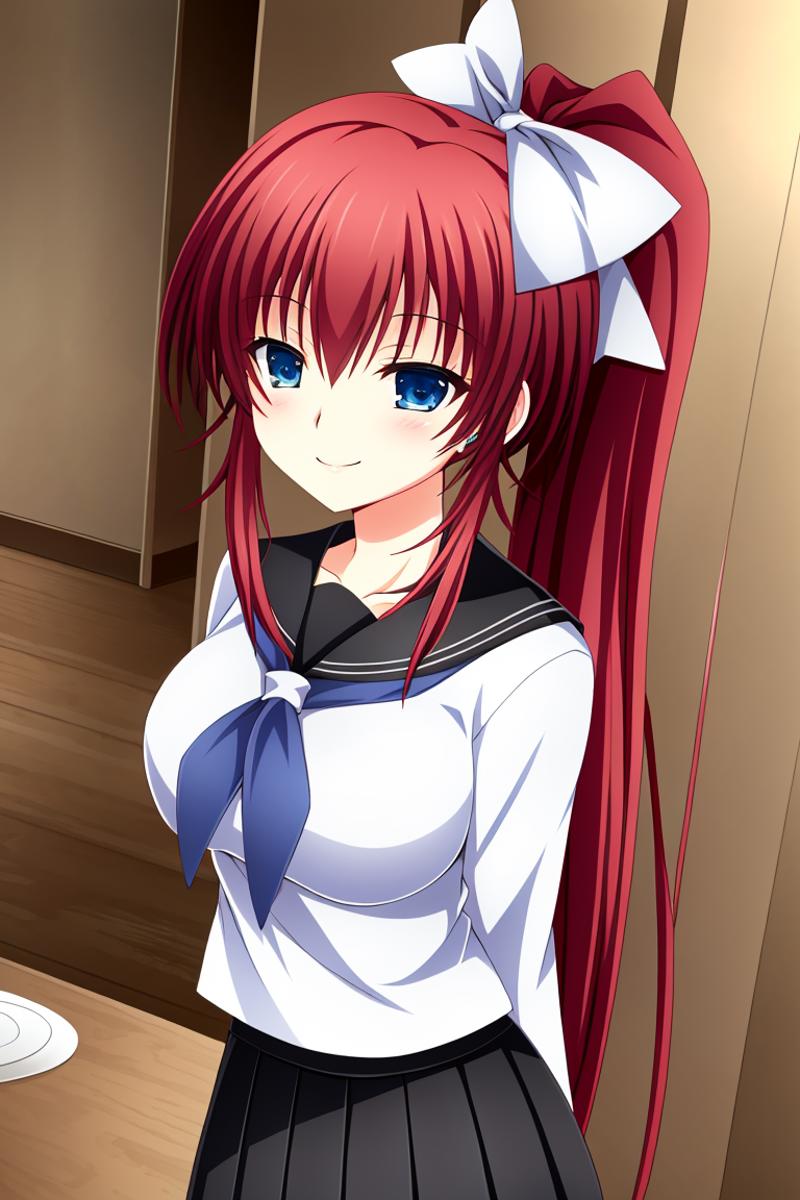 shiratorimikoto,big blue eyes,red hairs,red ponytail,white hair bow,middle breasts"
