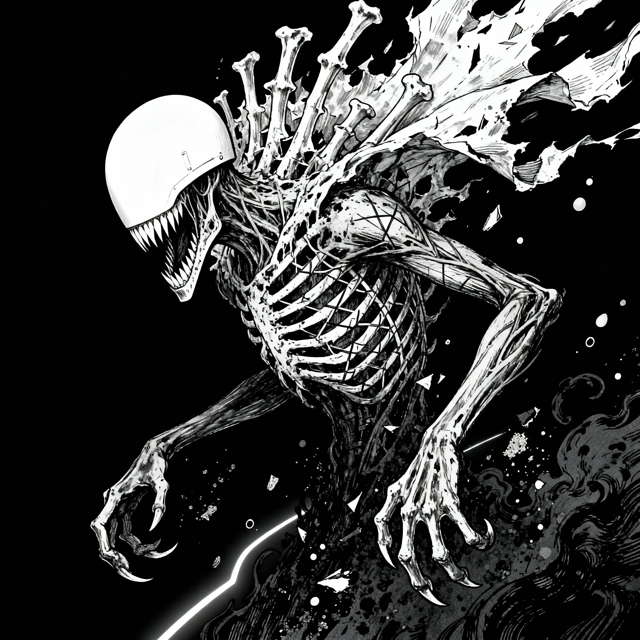 Prompt: " A raw, high-contrast black and white manga panel in Tsutomu Nihei's Blame! and ABARA style, ultra-detailed 8k scan with heavy scratched texture, dense crosshatching, ink splatters, floating droplets and film grain. Extreme close-up side profile of a terrifying silicon creature: completely smooth, featureless white helmet-visor head — pure Slenderman blankness, absolutely no eyes or mouth on the helmet — yet below it erupts a massive jagged mandible split wide in silent snarl, rows of razor-sharp teeth gleaming against black shadows. Above the helmet explodes a feral corona of splintered bone ridges and shredded membrane flanges unfurling like a tattered executioner's hood torn by hellish winds. Thorax is a cantilevered cage of hyper-elongated ribs covered in cross-hatched decay veins; long sinewy arms end in oversized taloned claws splayed hungrily, fingers curling through airborne grit and disintegrating flesh particles. Lower body fully dissolves into roiling black particulate chaos and ink void — no legs, swallowed by negative space. Creature floats alone in infinite featureless dark abyss, carved out only by a single dramatic rim light that traces razor-thin white highlights along silhouette edges. Maximum dread, unsettling horror, masterpiece detail on every bone shard, membrane tear and ink scratch"