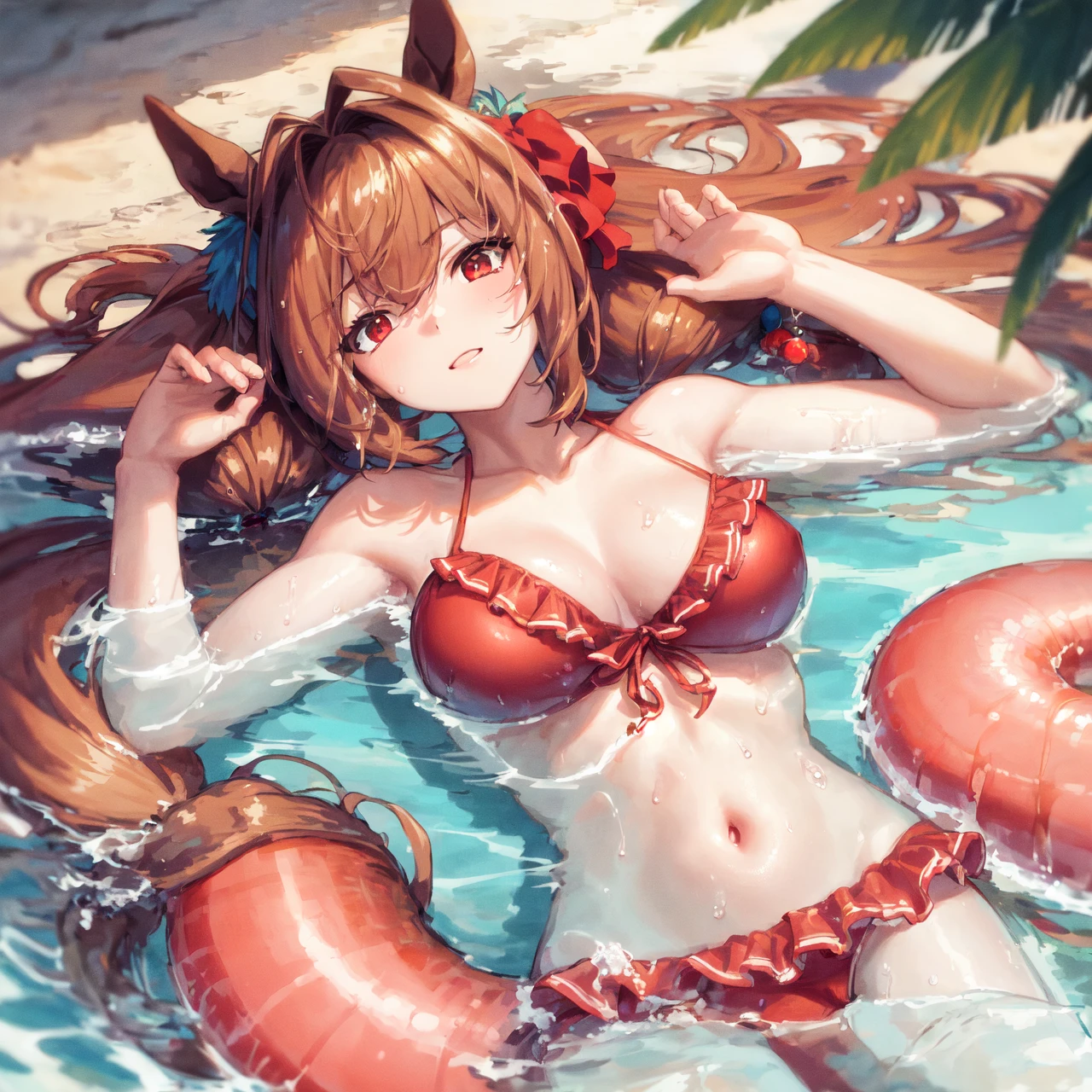 official alternate costume, official alternate hairstyle, low twintails, hair ornament, hair bobbles, navel, red bikini, frilled bikini, bikini skirt, swimsuit, frills