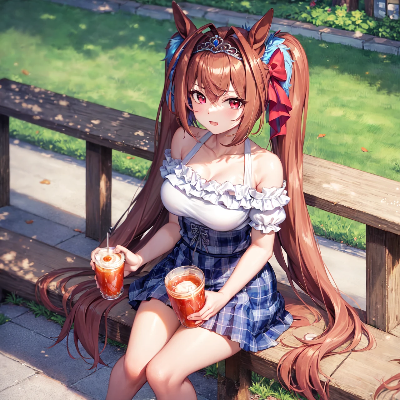 1girl, horse tail, twintails, horse girl, red hair, animal ears, brown eyes, very long hair, tail, bangs, fang, skin fang, hair between eyes, tail through clothes, horse ears, hair intakes, long hair, solo, pink eyes, brown hair, red eyes, antenna hair