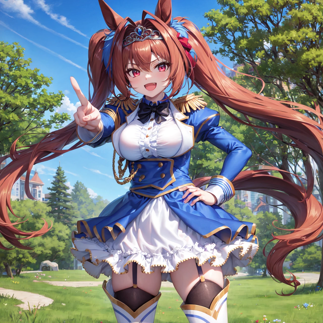 hair bow, red bow, tiara, epaulettes, puffy long sleeves, juliet sleeves, black bowtie, white shirt, framed breasts, blue jacket, blue dress, center frills, underbust, layered skirt, garter straps, white thighhighs, white footwear