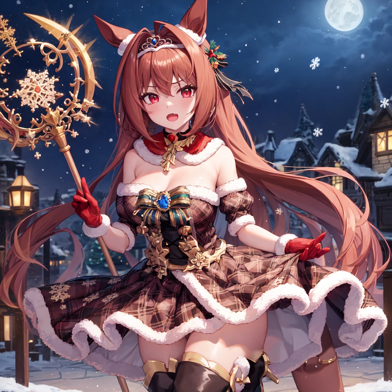 official alternate costume, official alternate hairstyle, single ear cover, christmas, tiara, bare shoulders, detached sleeves, jewelry, fur trim, brooch, red gloves, fur-trimmed gloves, red dress, fur-trimmed dress, plaid dress, black skirt, black thighhighs, thigh boots, high heel boots, black footwear