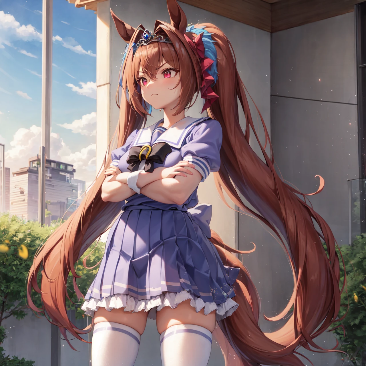 tracen school uniform, summer uniform, serafuku, puffy short sleeves, bowtie, horseshoe ornament, tiara, sailor collar, sailor shirt, frills, white skirt, purple shirt, miniskirt, zettai ryouiki, white thighhighs, brown footwear, shoes,
