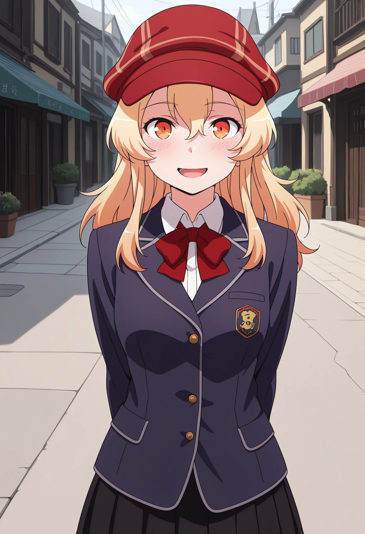 white capelet, red neck ribbon, white collar, red vest, black pleated skirt, red deerstalker, white long sleeves,