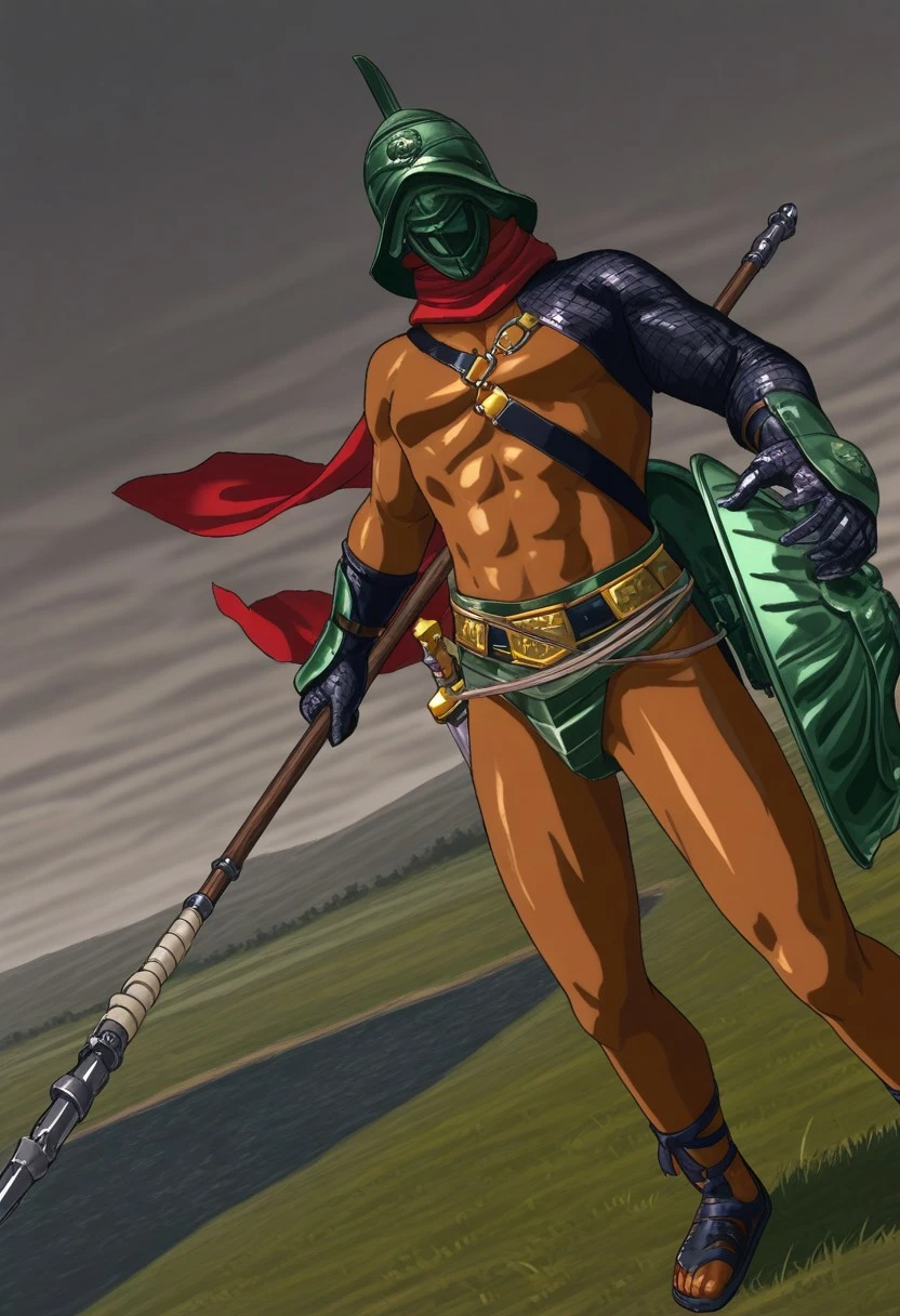 dark skin, dark-skinned male, masked man, mask, helmet, green helmet, covered face, shirtless, ??????? male, barechested male,