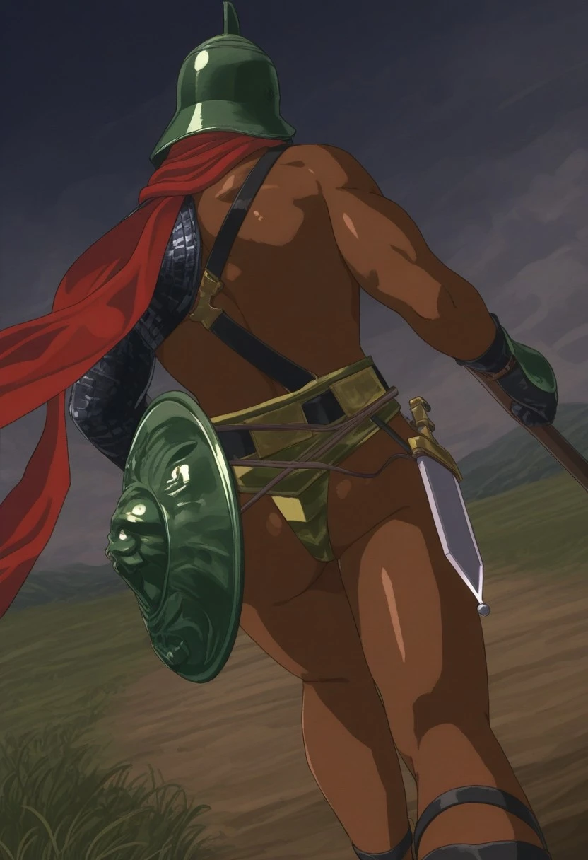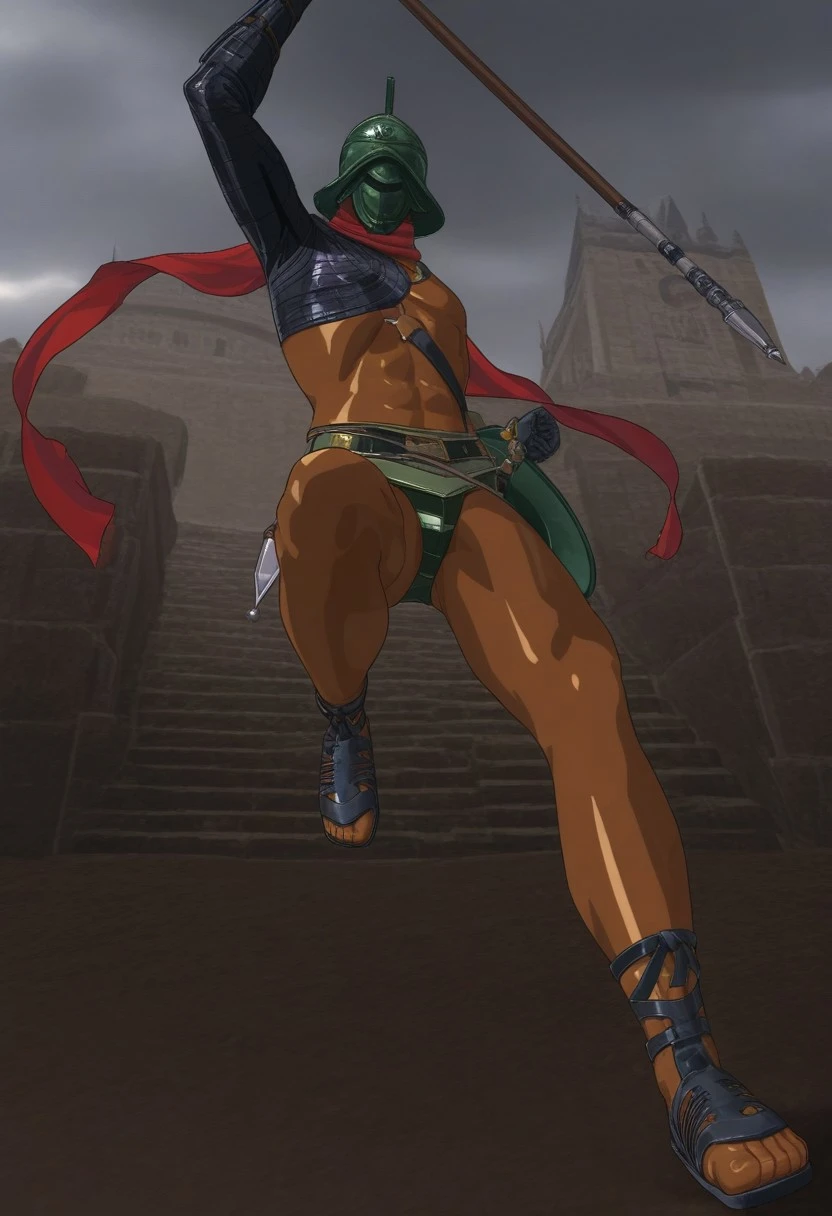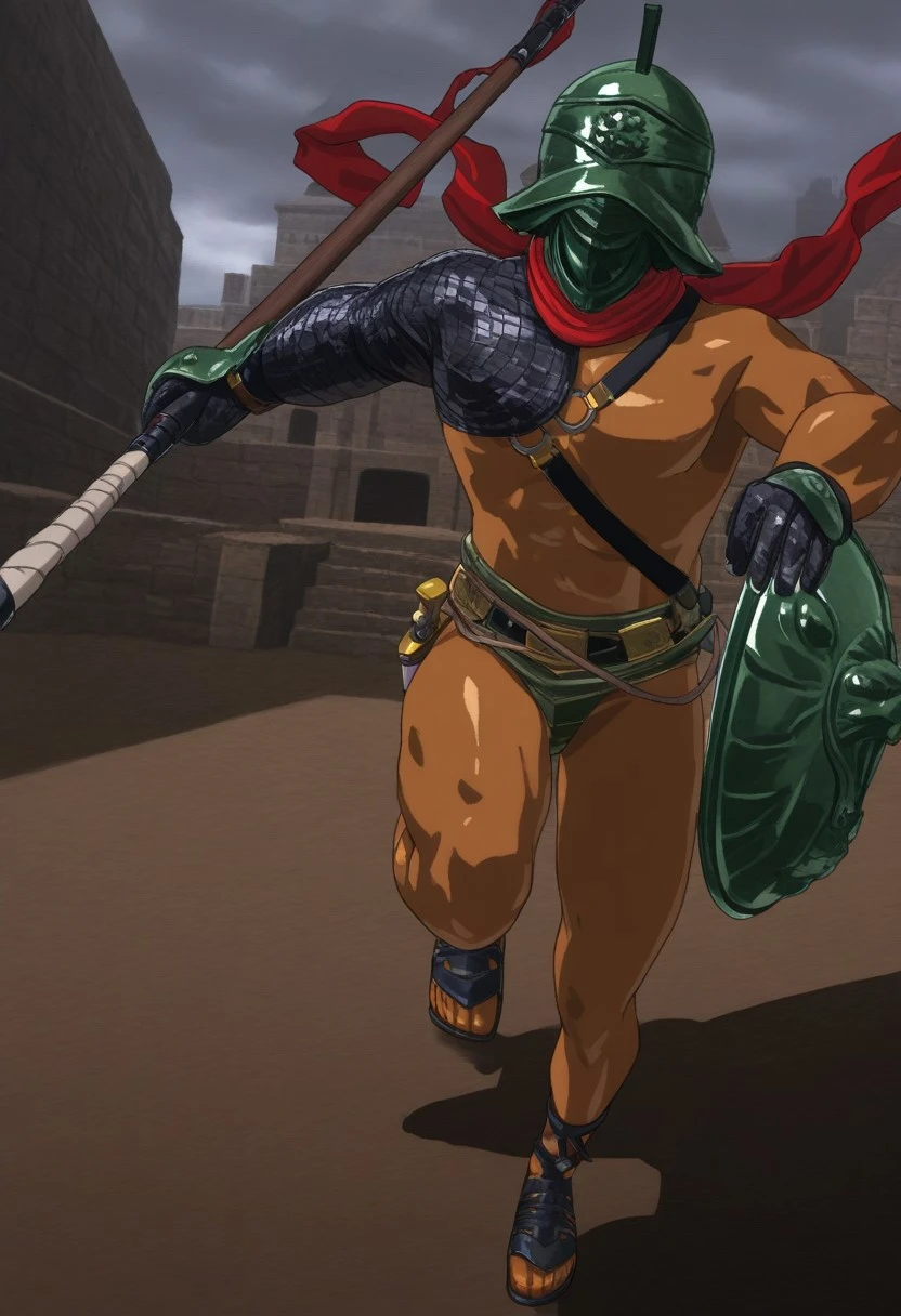 scarf, red scarf, gloves, black gloves, vambraces, green vambraces, single shoulder chaimail, armor, harness, belt, olive color skimpy armor, olive color bikini armor, olive color underwear, sandals, gladiator sandals,