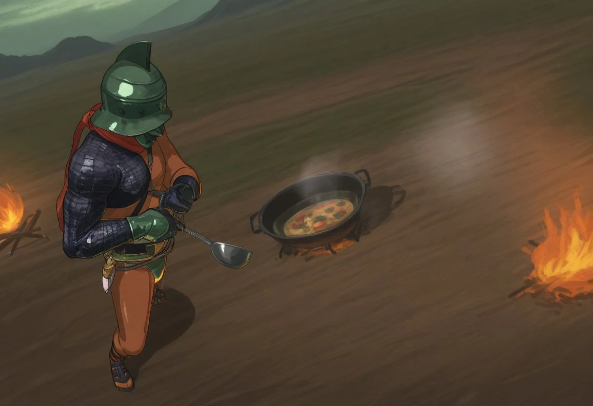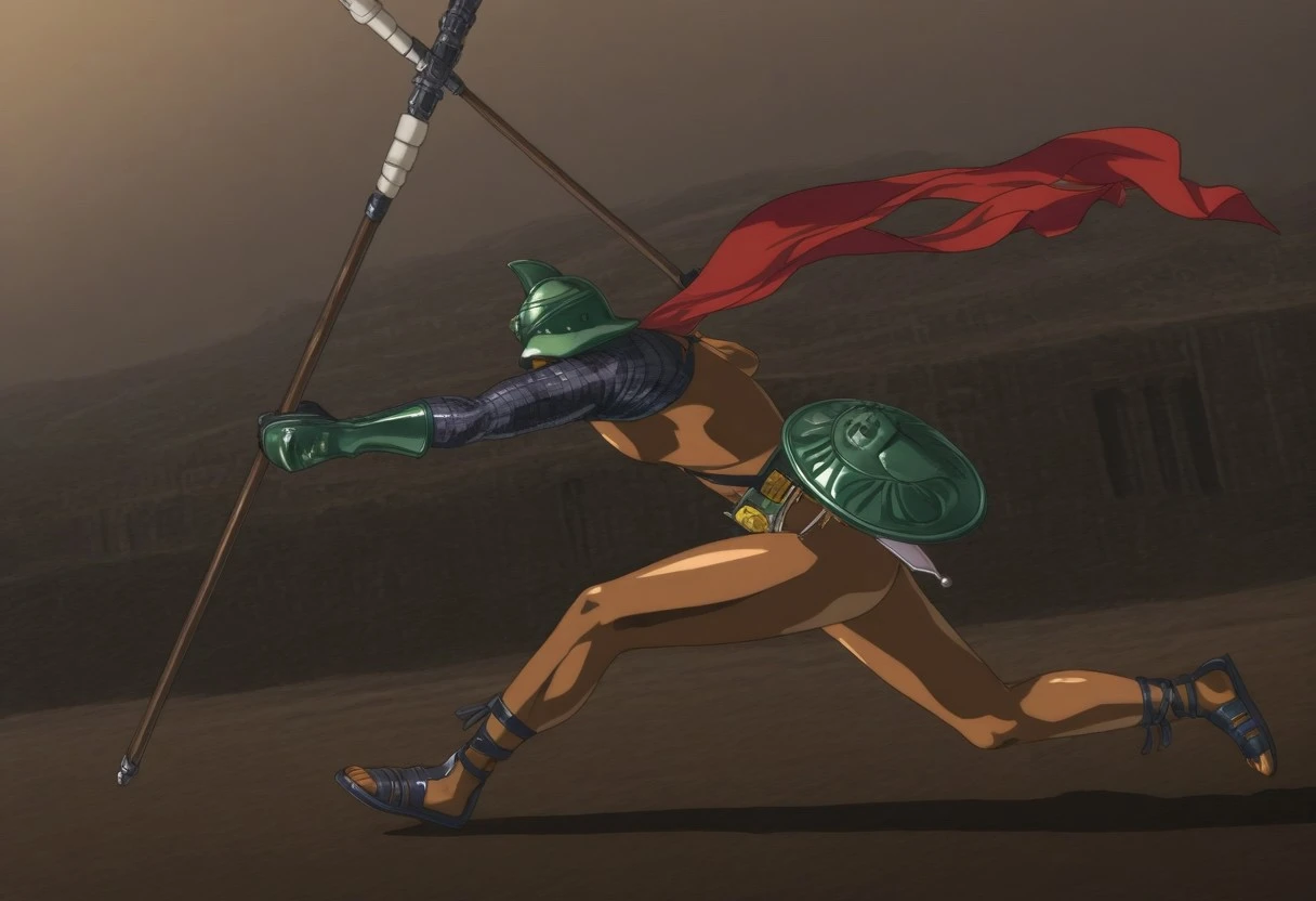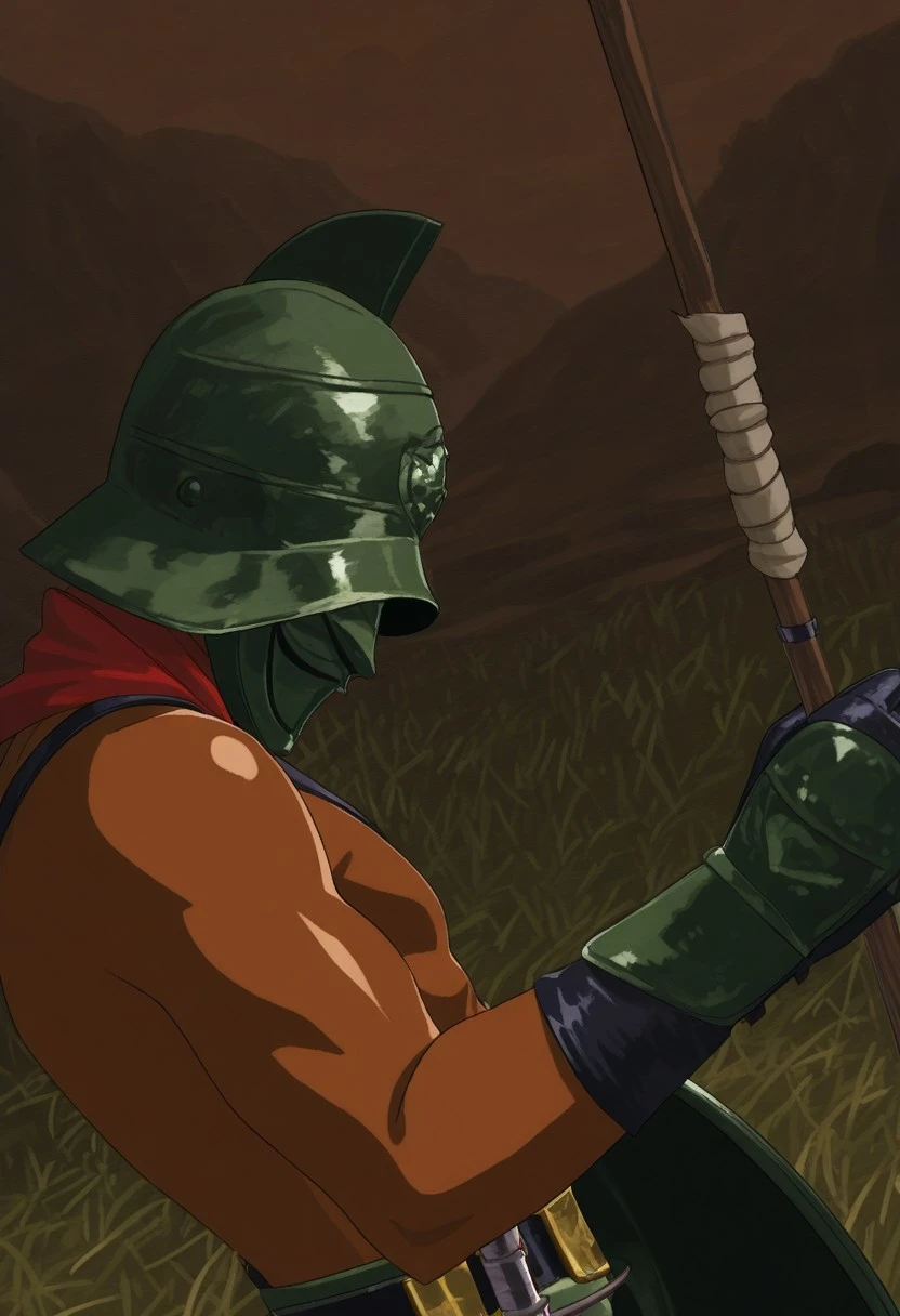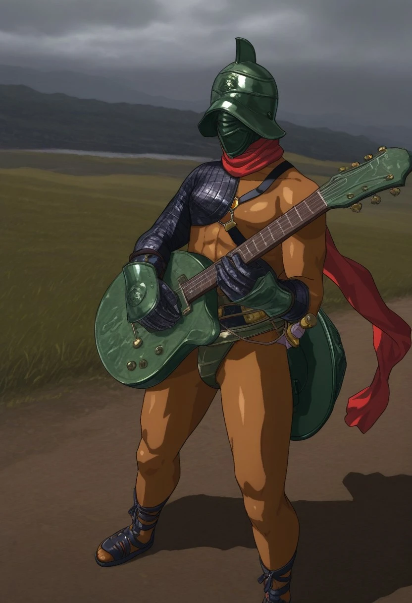scarf, red scarf, gloves, black gloves, vambraces, green vambraces, single shoulder chaimail, armor, harness, belt, olive color skimpy armor, olive color bikini armor, olive color underwear, sandals, gladiator sandals,