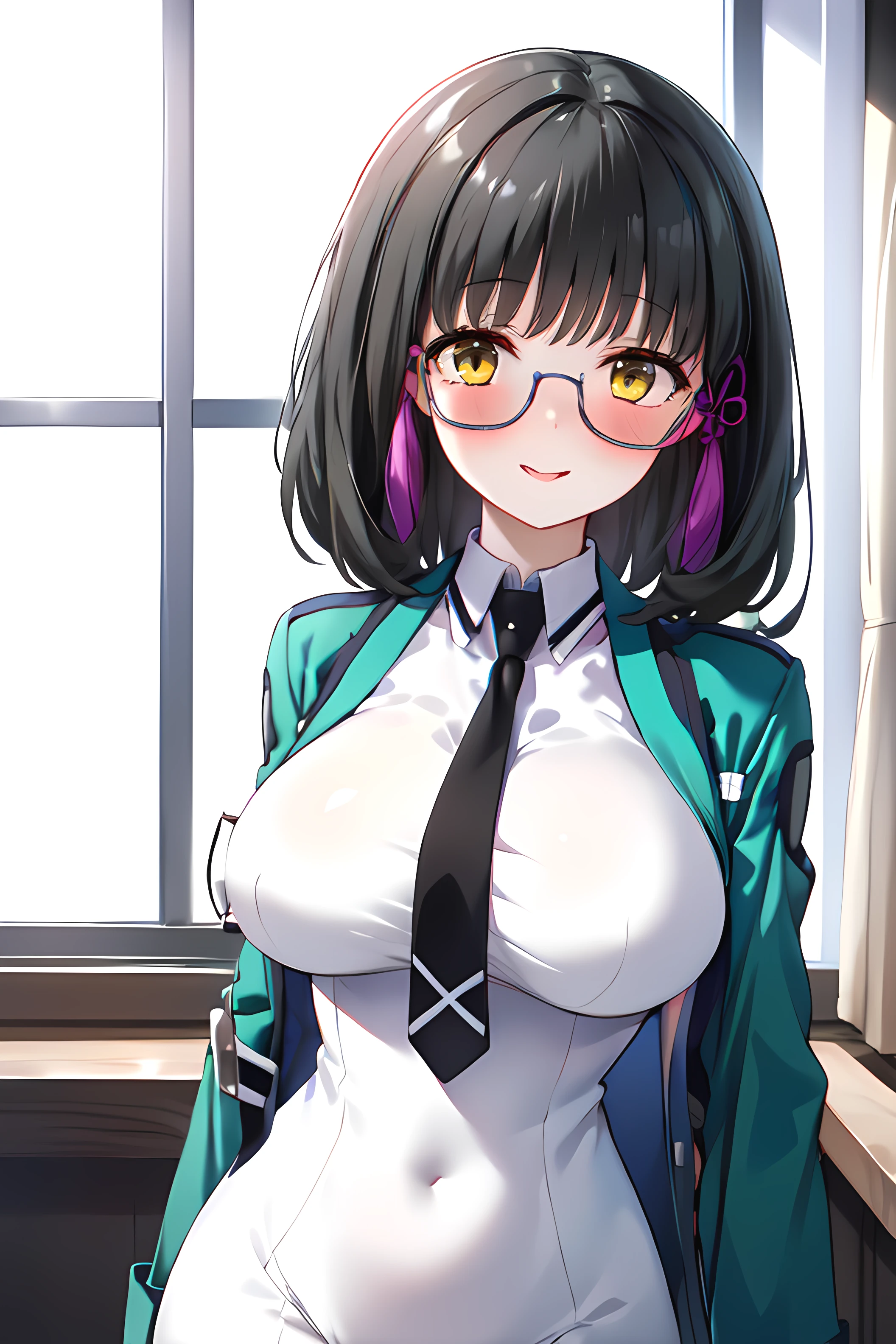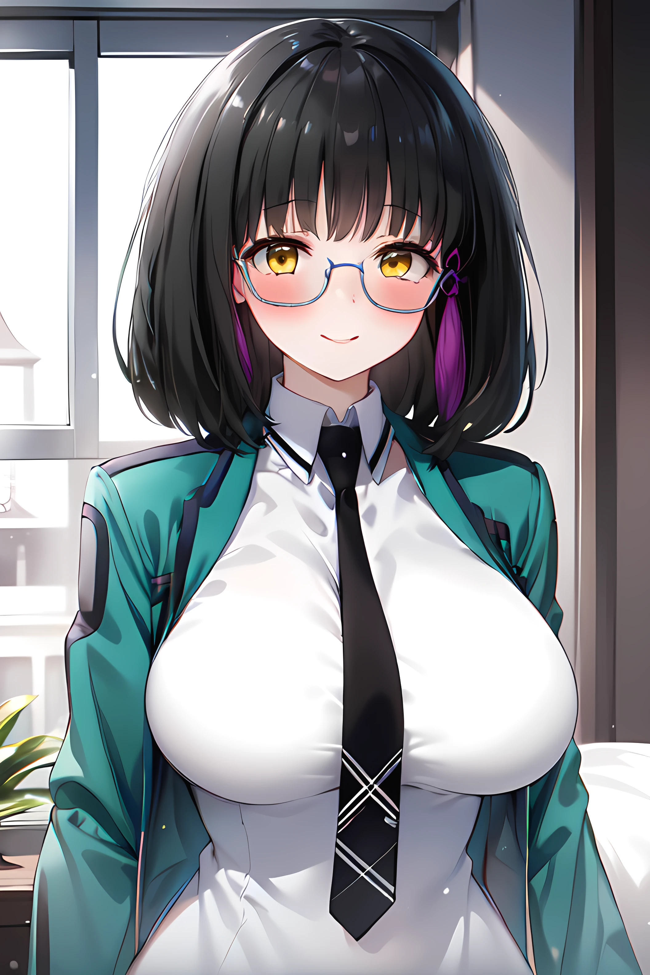 mizuki shibata,yellow_eyes,black_hair, black_necktie,collared_shirt, long_sleeves, eyebrows_visible_through_hair,white_shirt,necktie,short_hair,jacket,dress,green jacket,black_necktie,skirt,glasses