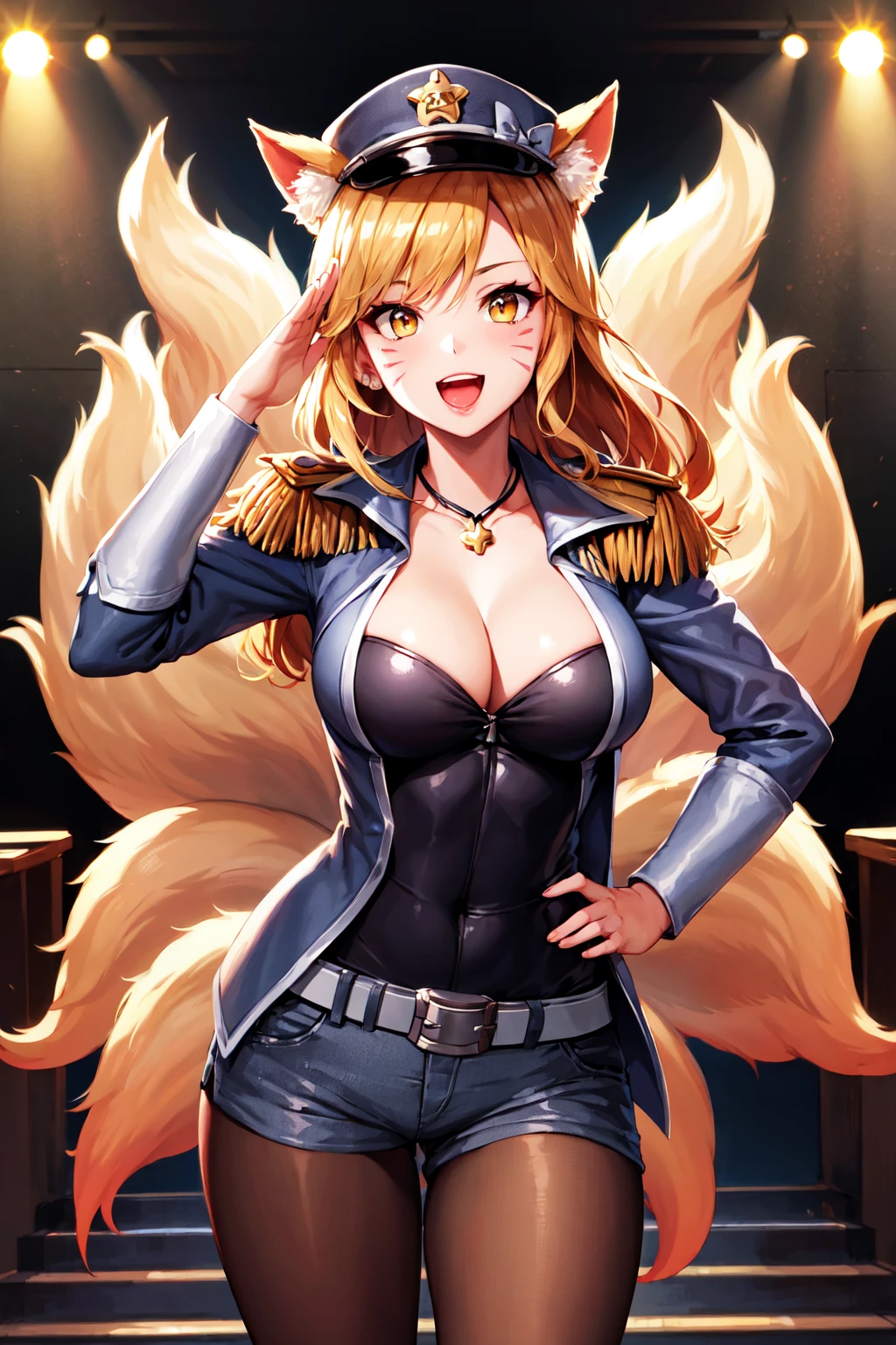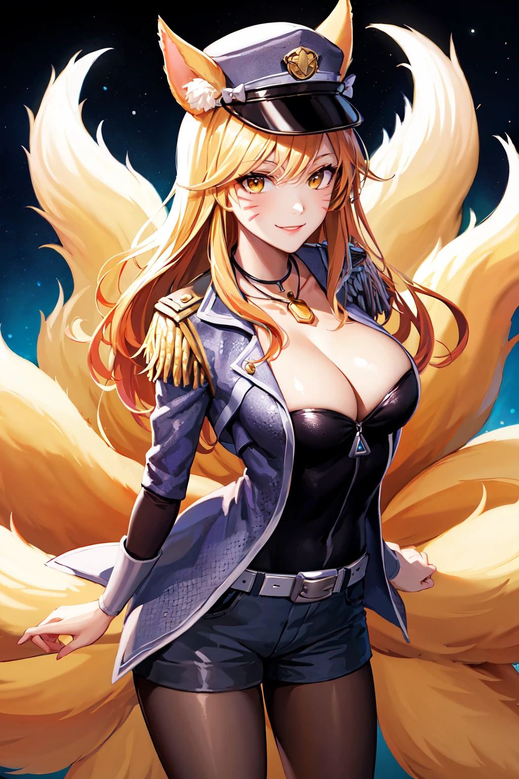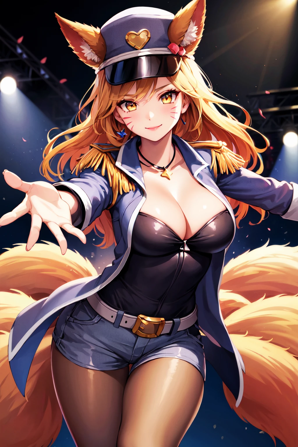 outfit2 (popstar)ah2, facial mark, multiple tails, fox tail, hat bow, necklace, peaked cap, jewelry, cleavage, epaulettes, necklace, belt, open jacket, short shorts, black pantyhose, long sleeves, large breasts