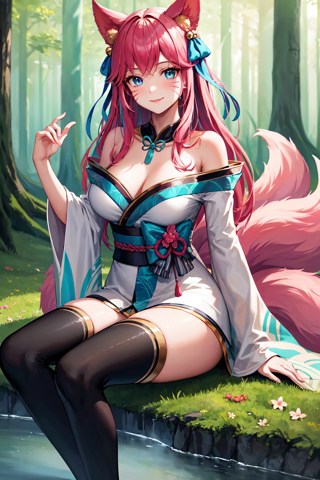 outfit4 (sprit blossom)ah4, pink hair, facial mark, multiple tails, fox tail, japanese clothes, bare shoulders, white thighhighs, hair ribbon, large breasts