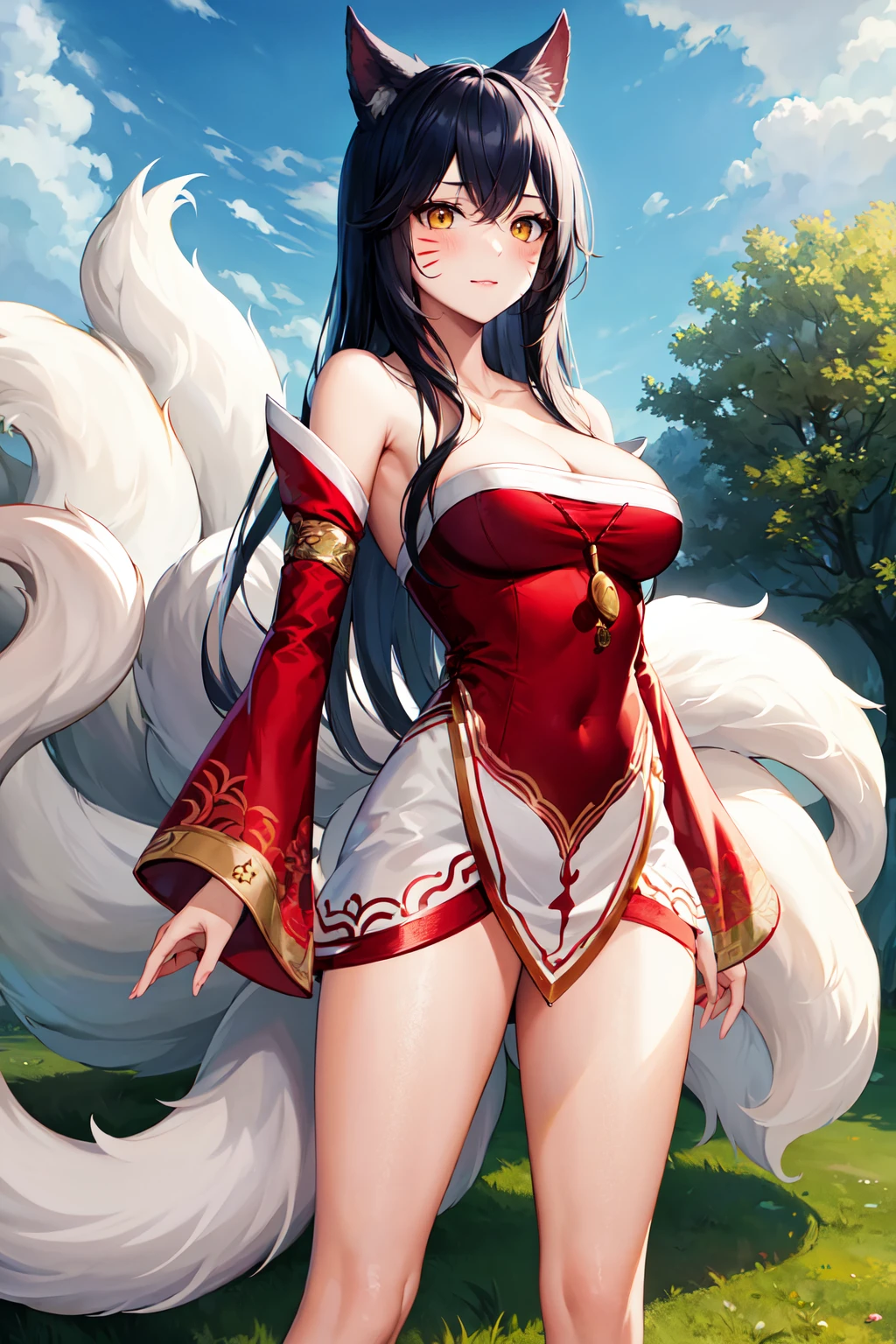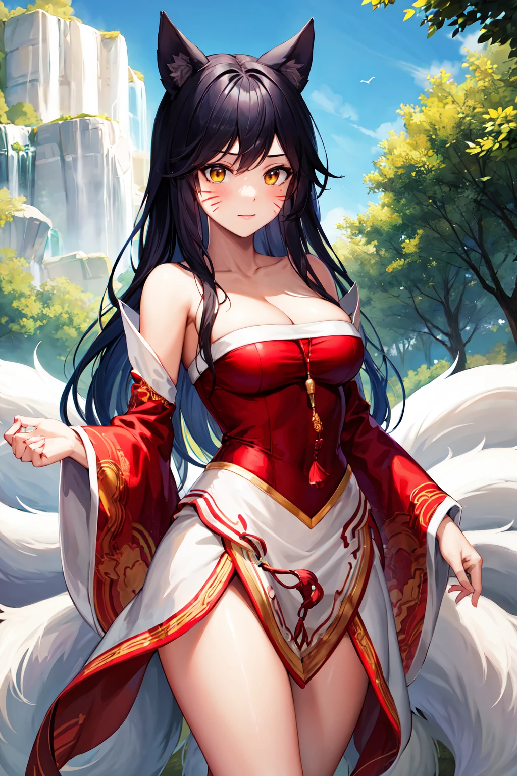 outfit1 (normal)ah1, facial mark, multiple tails, fox tails, korean clothes, cleavage, bare shoulders, detached sleeves