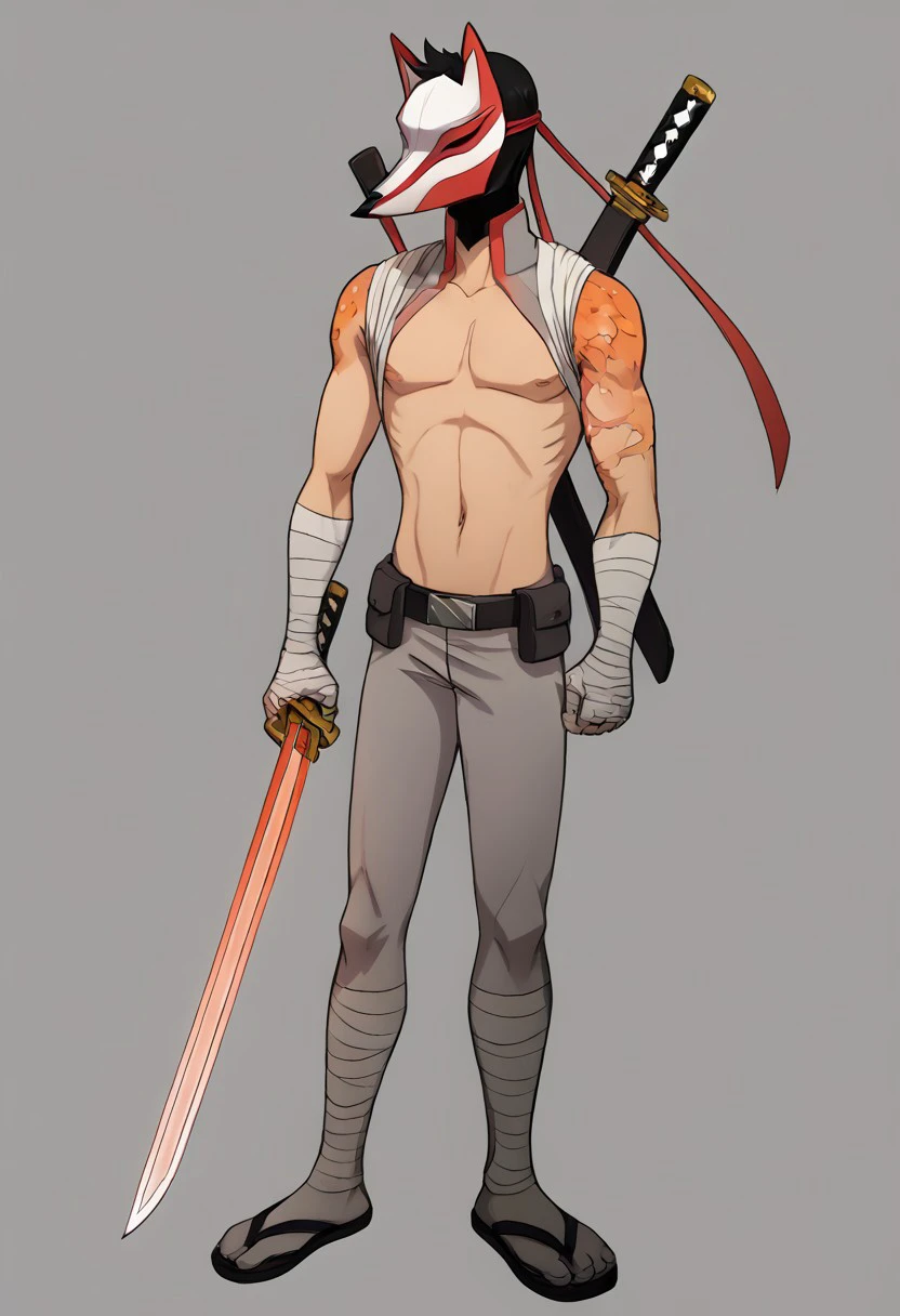 Black hair, fox mask, bandaged arms, bandaged legs, grey pants, body suit, ninja sandals, katanas,