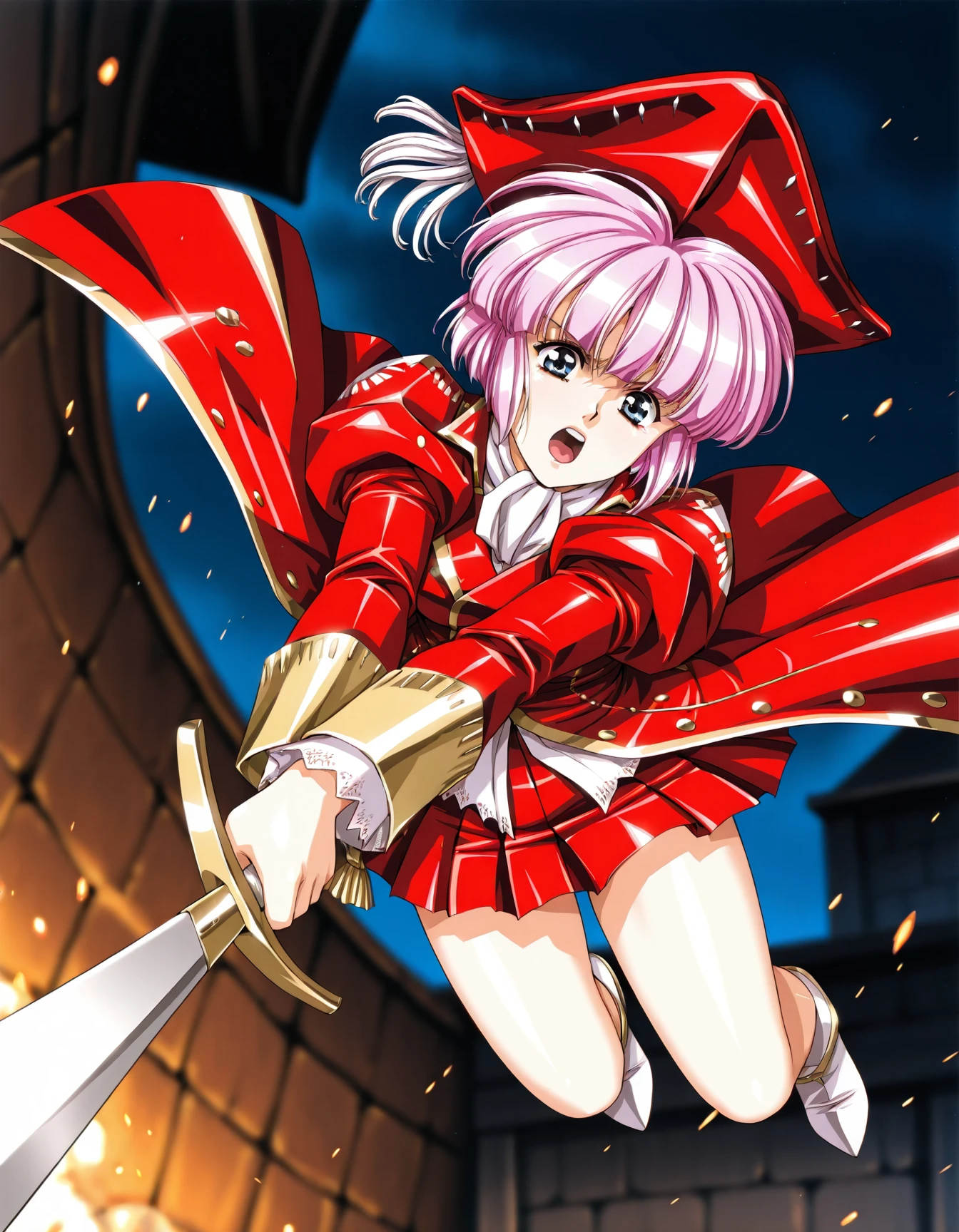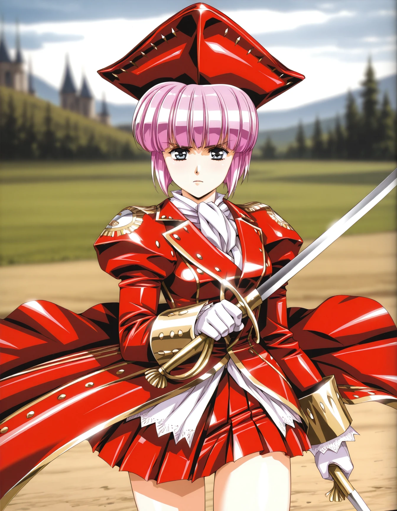 diana silverneil, tricorne, juliet sleeves, coat, red coat, red skirt, miniskirt, white footwear