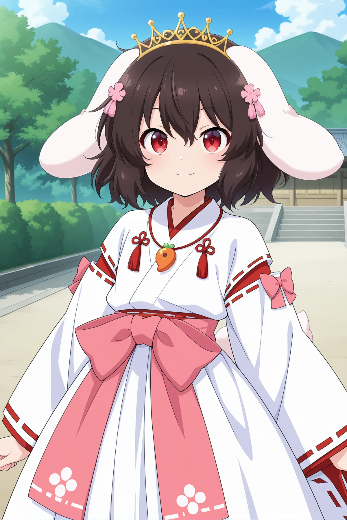 inaba tewi, 1girl, solo, red eyes, black hair, short hair, rabbit ears, floppy ears, rabit tail, inaba tewi \(happy patissiere\), ahoge, alternate costume, chef hat, white hat, red bowtie, pink dress, food-themed clothes, frilled apron, frilled dress, waist apron, pink apron, pink ribbon, puffy short sleeves, ribbon-trimmed apron, ribbon-trimmed dress, vertical-striped bow, vertical-striped dress, white gloves, white skirt, blue footwear, buttons, inaba tewi, 1girl, solo, red eyes, brown hair, short hair, rabbit ears, floppy ears, rabit tail,, inaba tewi \(white earth rabbit\), alternate costume, dress bow, pink bow, magatama necklace, tassel, white dress, white skirt, white kimono, ribbon-trimmed sleeves, long sleeves, wide sleeves, hair ornament, gold tiara, miko crown, miko, Description