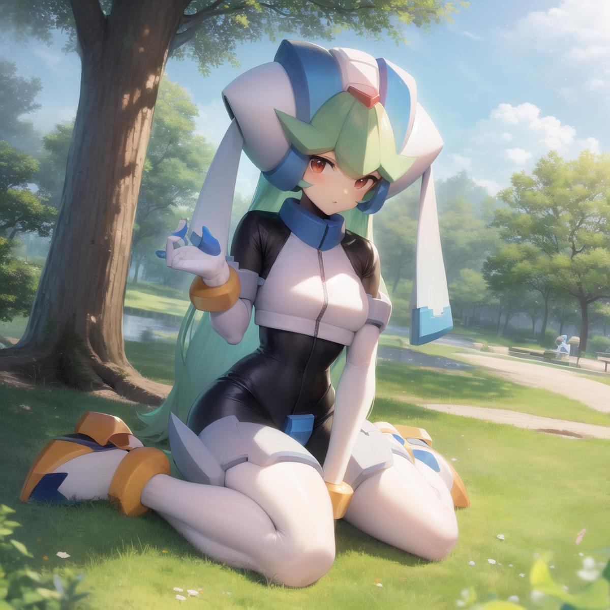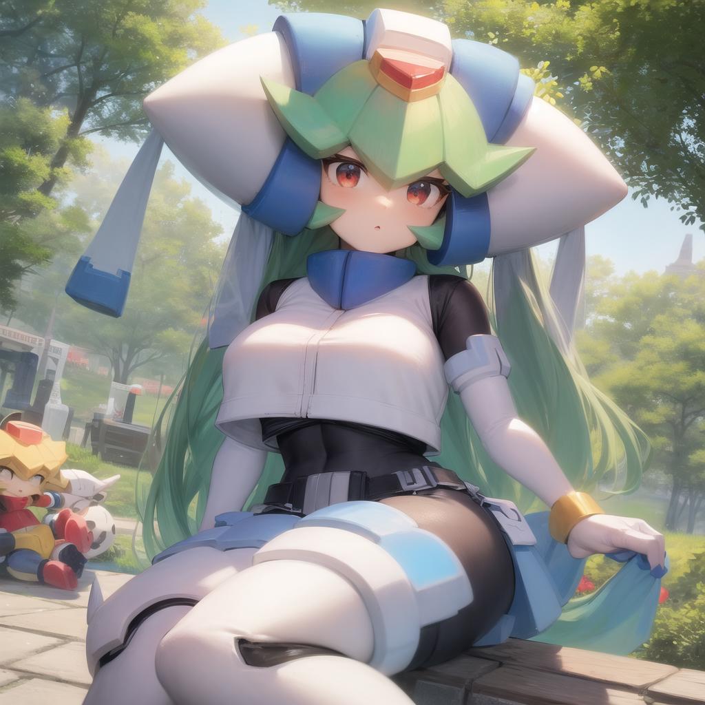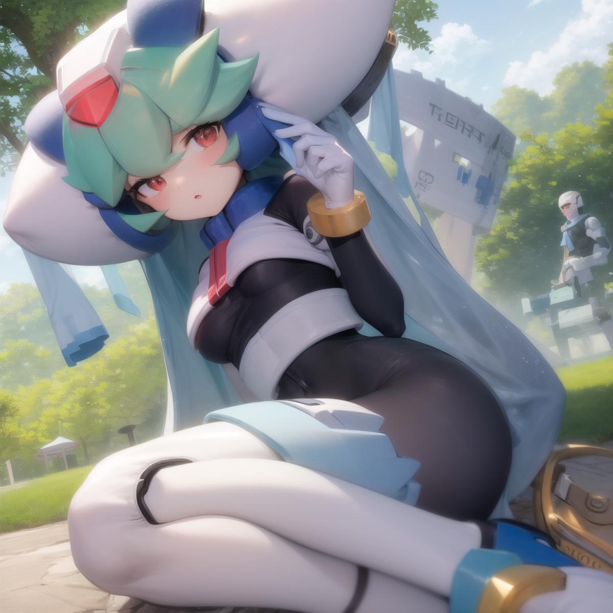 Pandora, android, green hair, red eyes, head piece