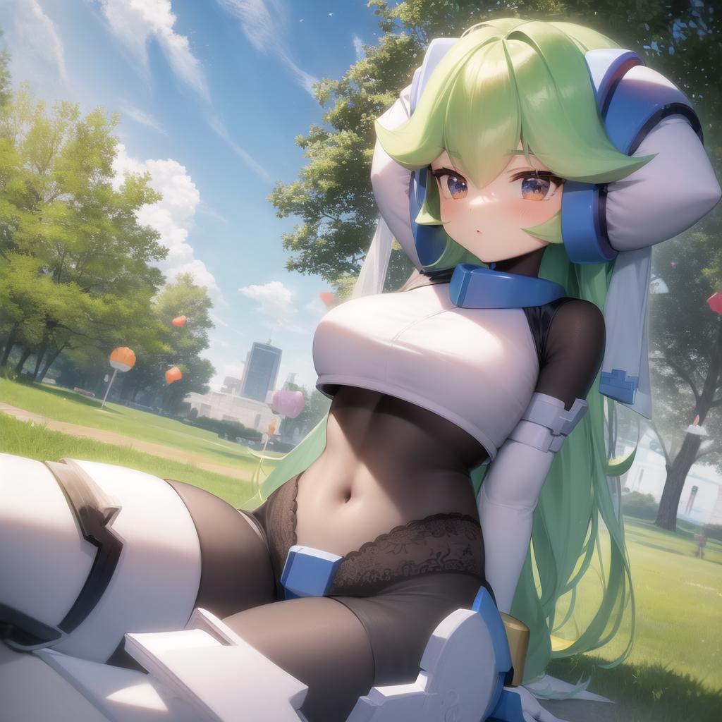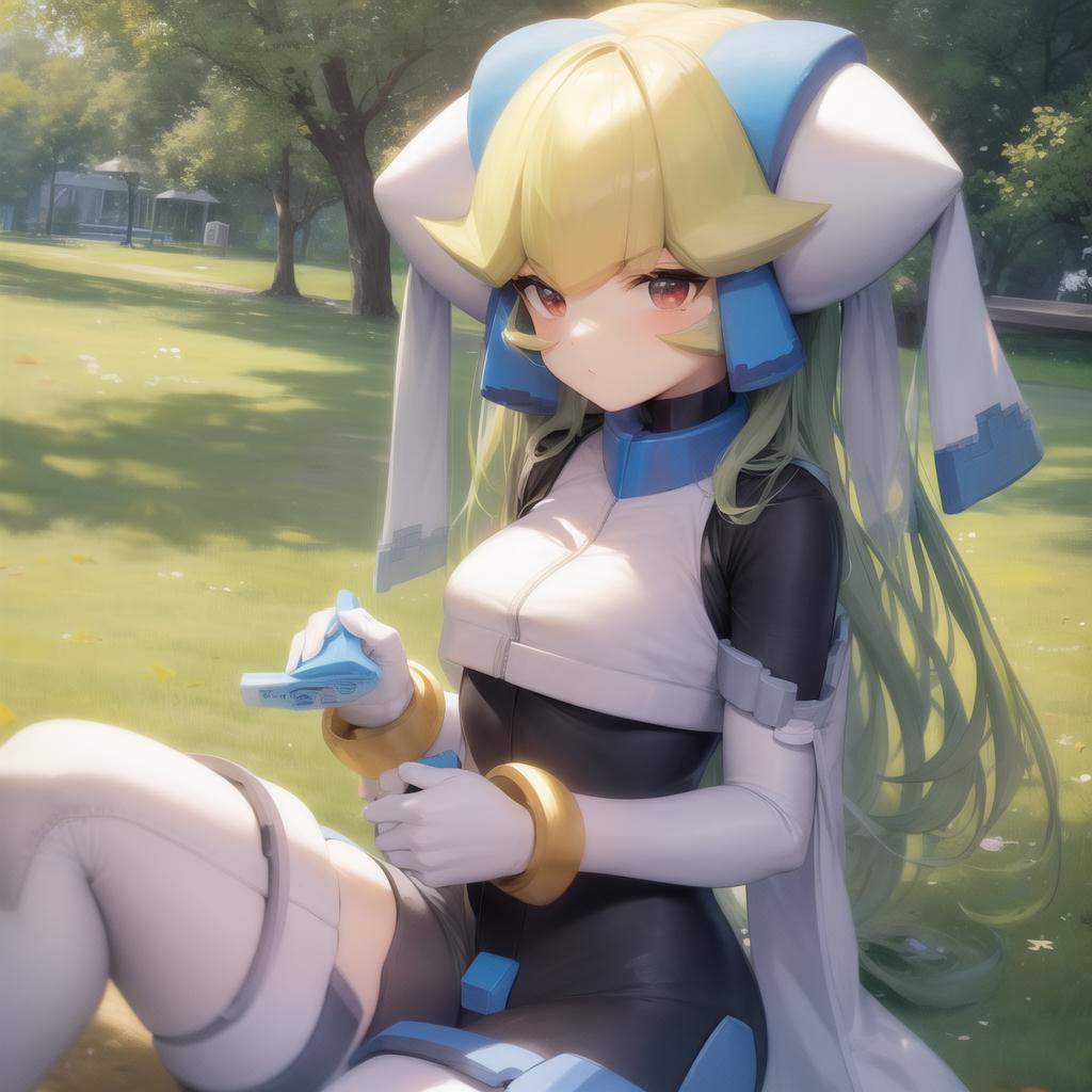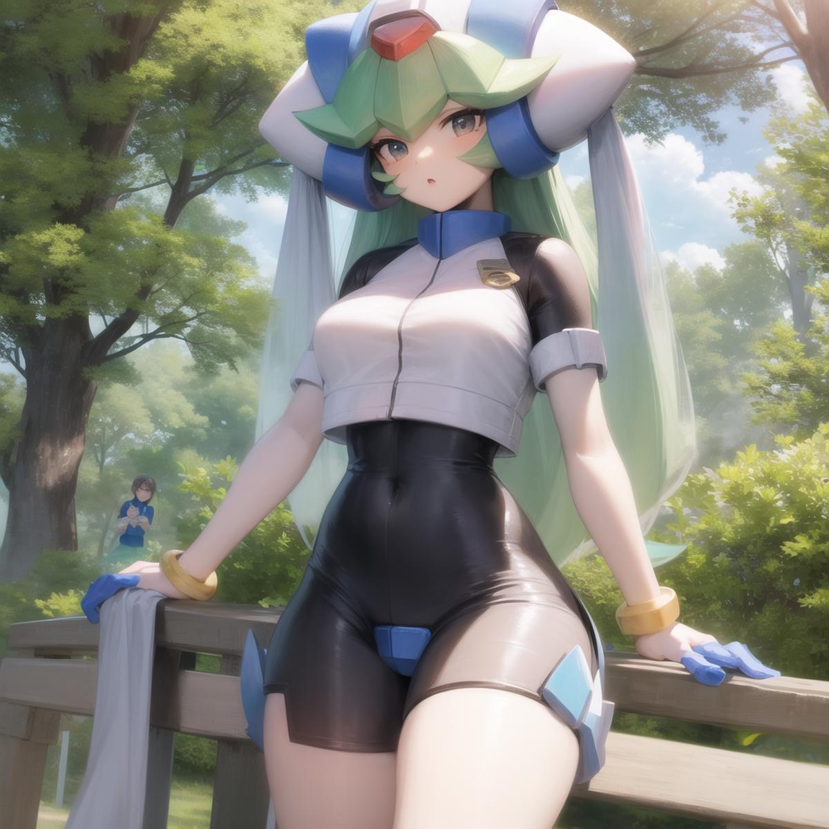 Pandora, android, green hair, red eyes, head piece