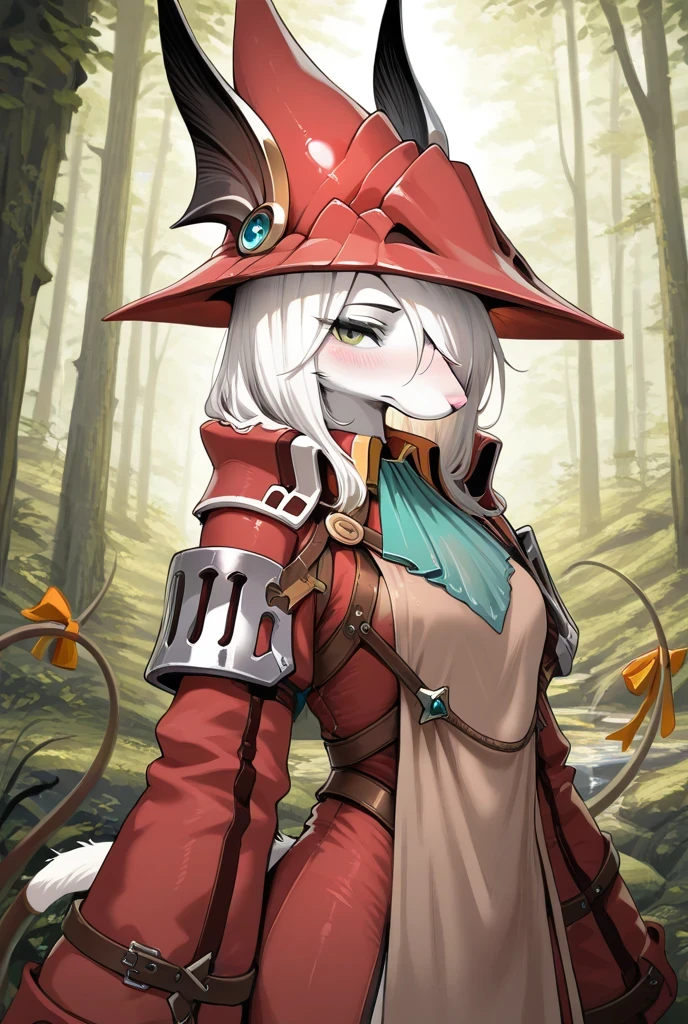 1girl, Freya, white fur, white hair, green eyes, long tail, snout, animal ears, red hat, winged hat, red coat