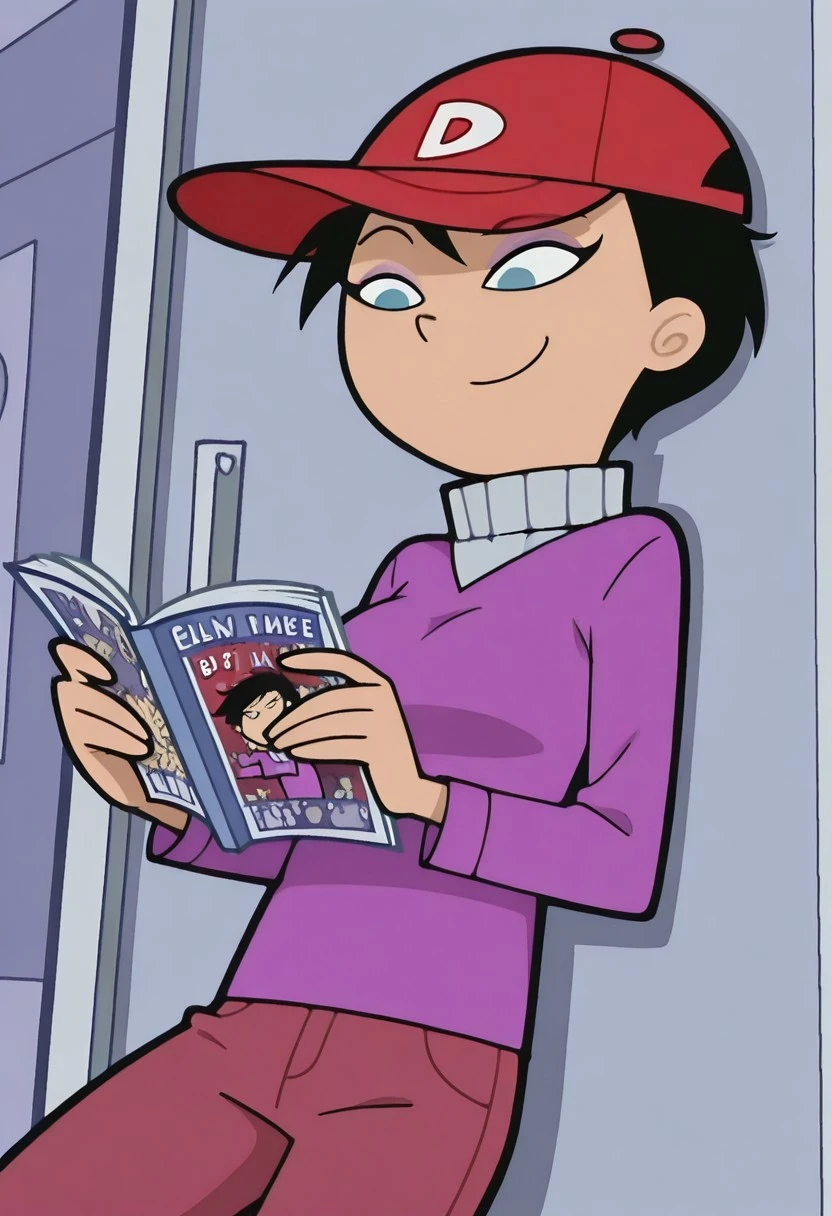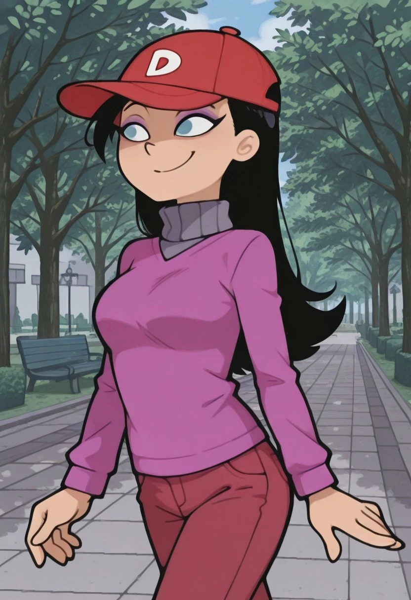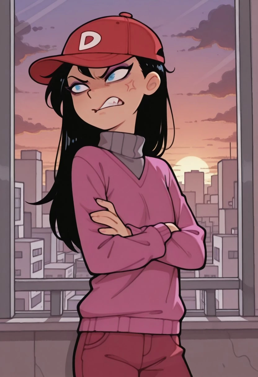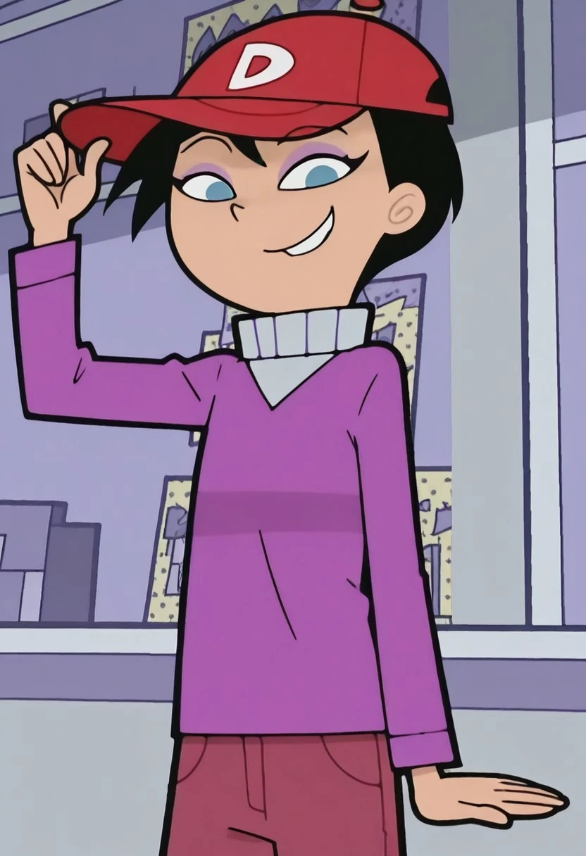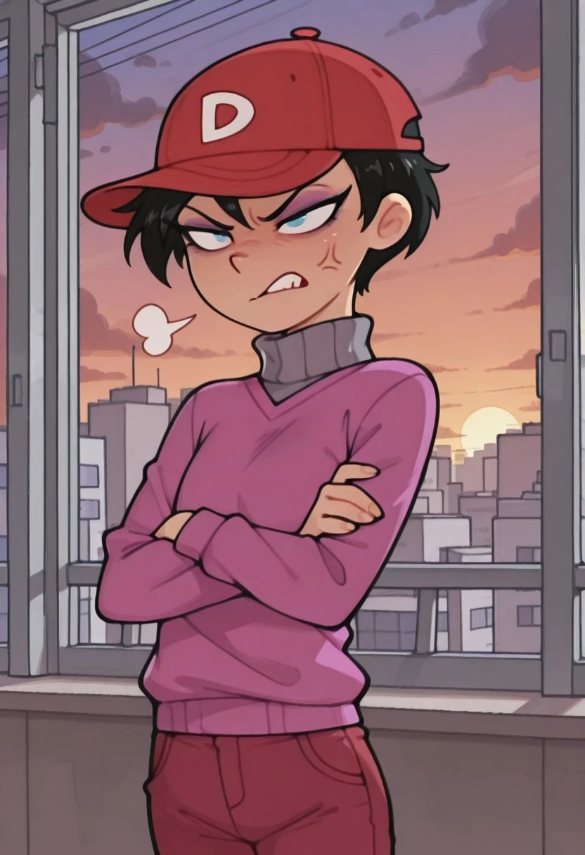 baseball cap, long hair tucked inside the cap, pink sweater with gray turtleneck, red pants, shoes