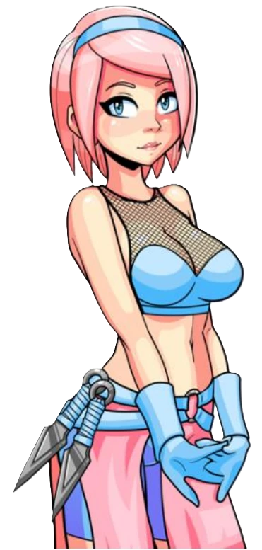 01.Haru: Haru, 1girl, solo, breasts, large breasts, blue eyes, short hair, bangs hair, pink hair, blue hairband, blue ninja fishnet bodysuit, blue gloves, sleeveless off shoulder, kunai hanging on the belt, blue belt, blue short, pink slit short skirt