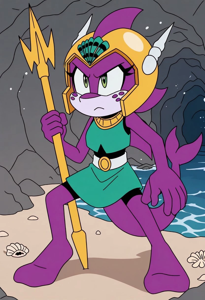 Echo the Dolphin, purple skin, green eyes, no nose, purple head fin, purple tail, golden helmet, golden collar, black and green tunic, holding long gold spear