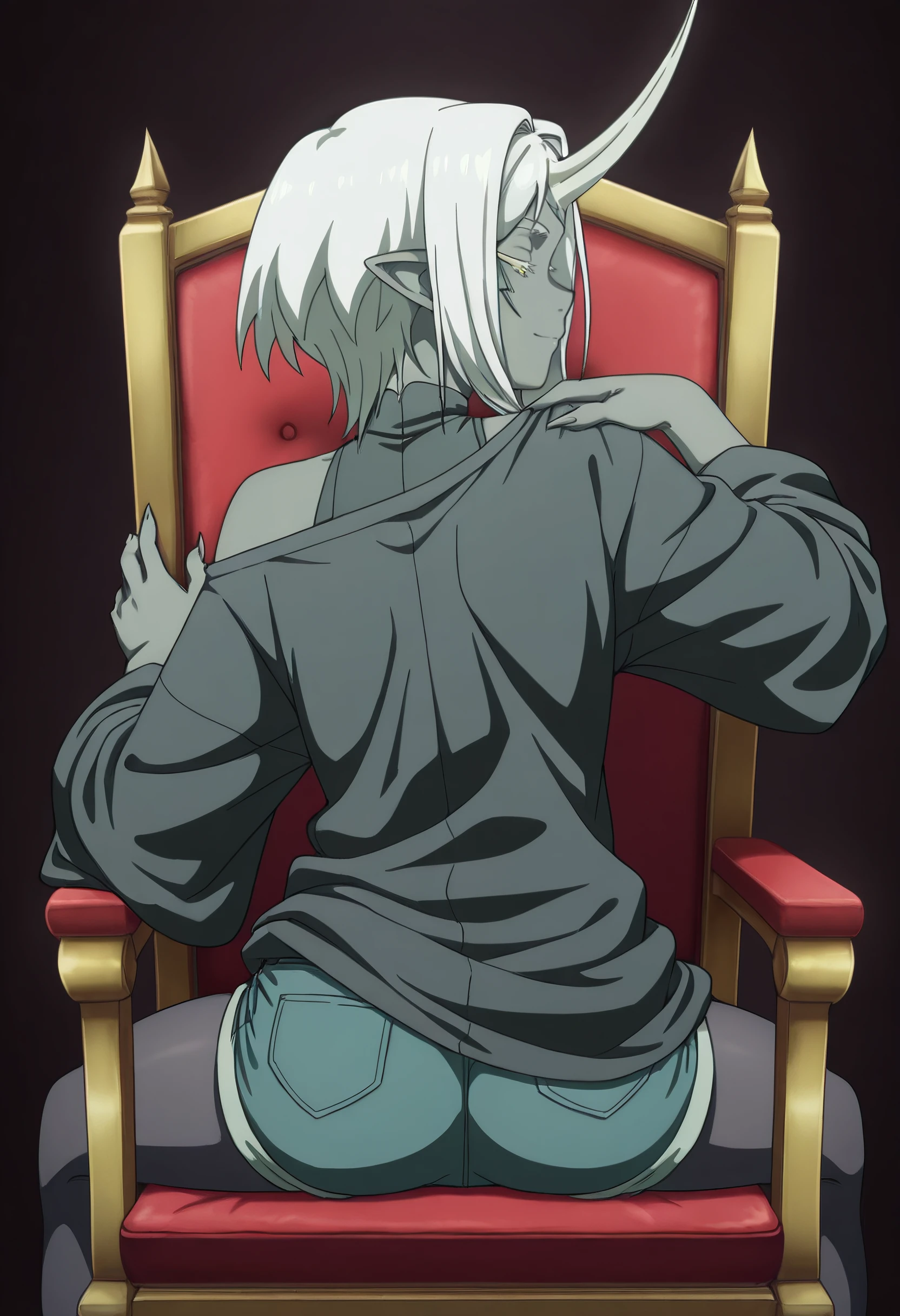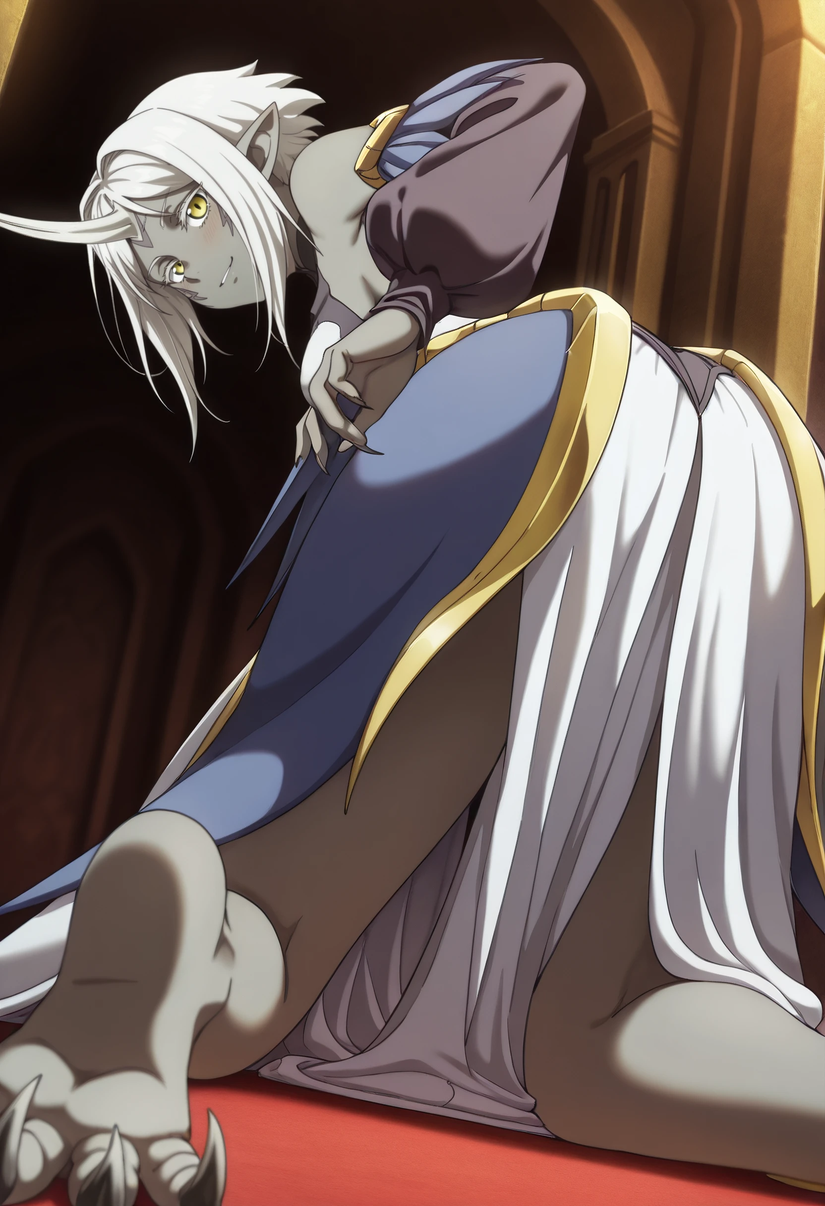 TNSYulriga, pointy ears, short hair, white hair, monster girl, facial mark, yellow eyes, colored skin, single horn, grey skin, colored eyelashes, dark skin, dark-skinned female, sharp fingernails, claws,