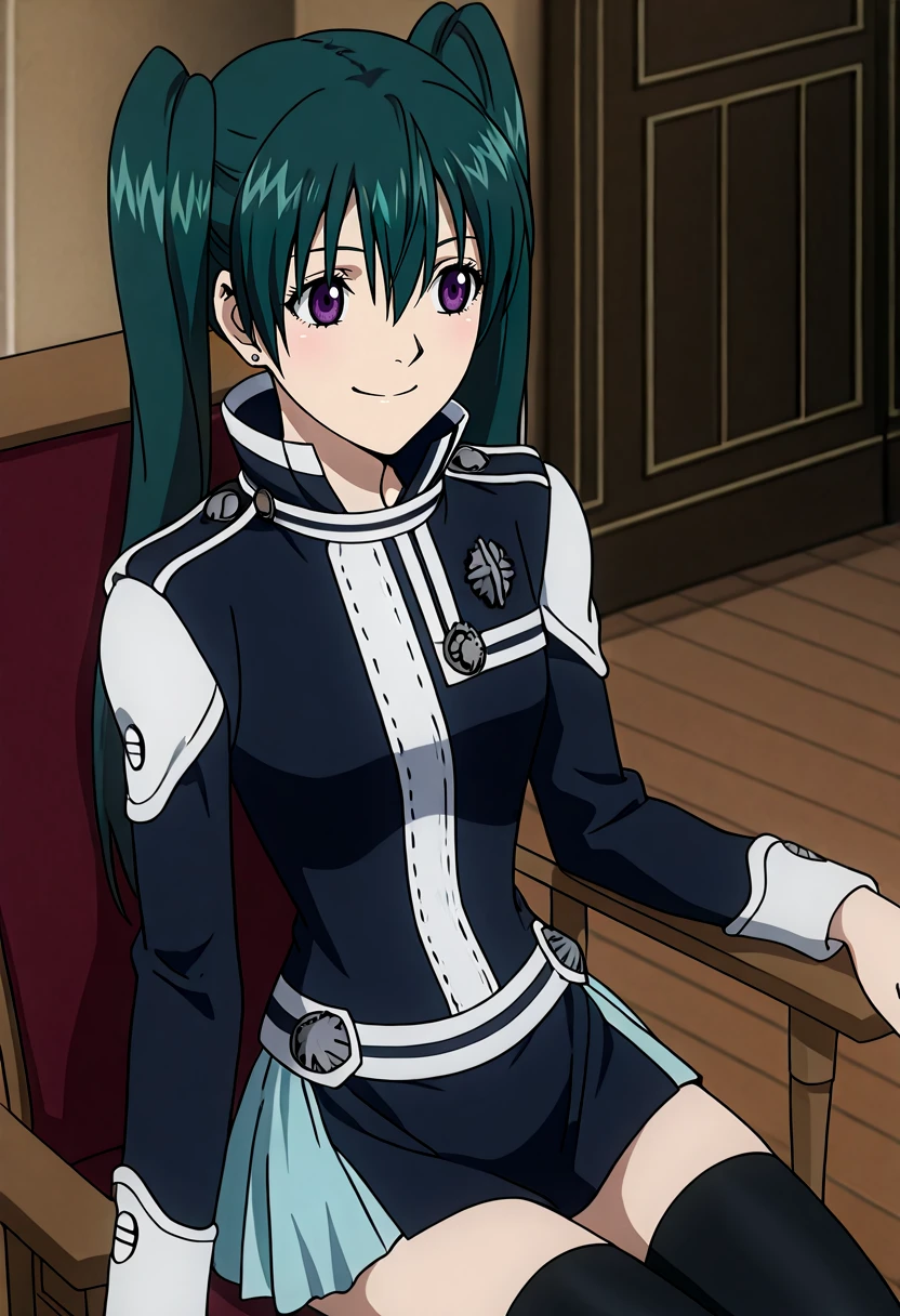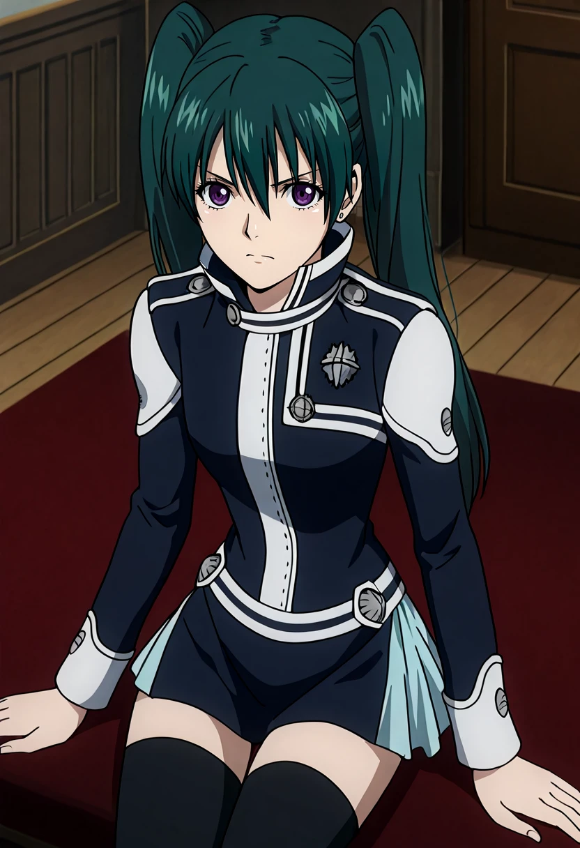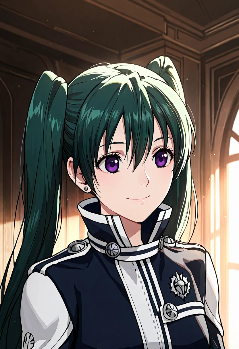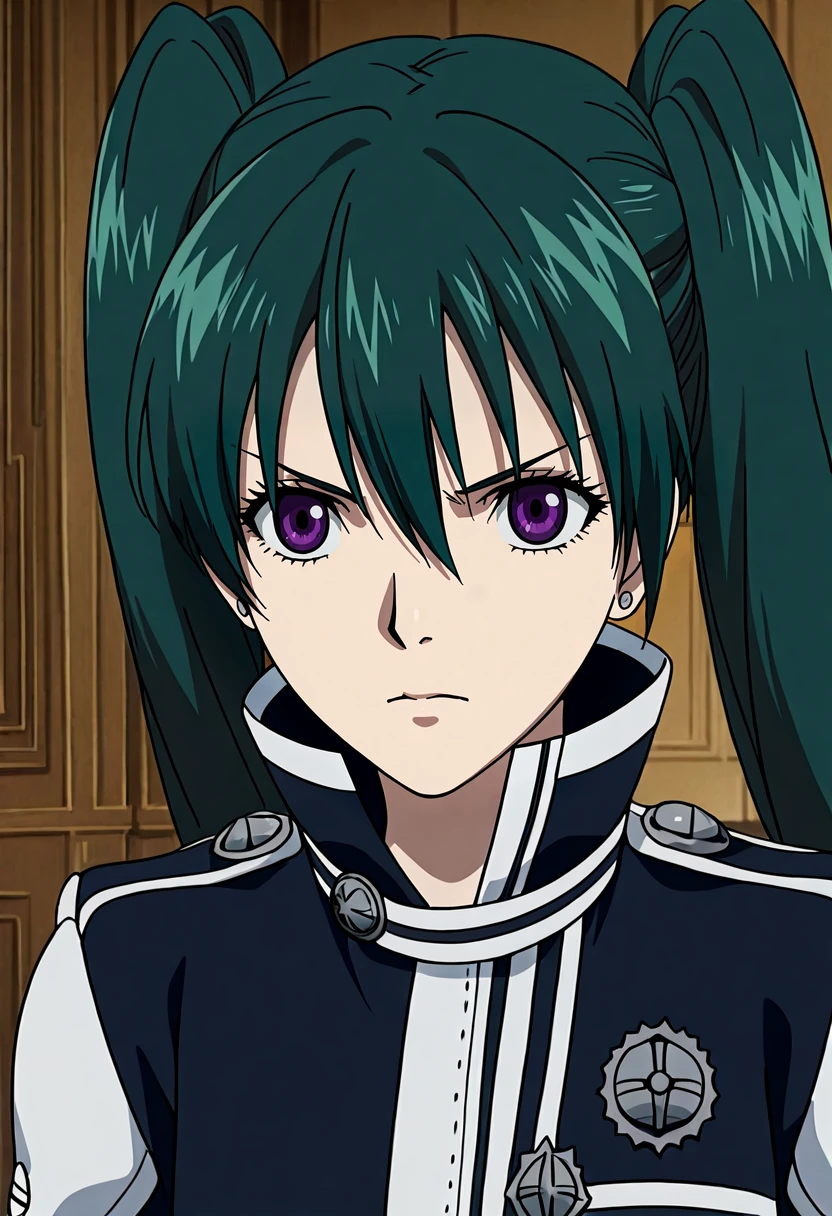 lenalee, 1girl, green hair, purple eyes, twintails,