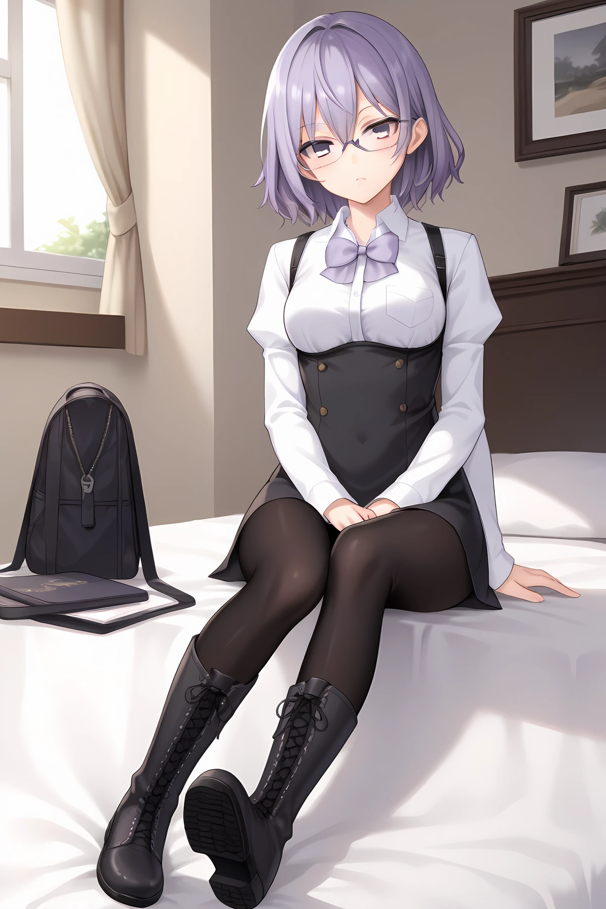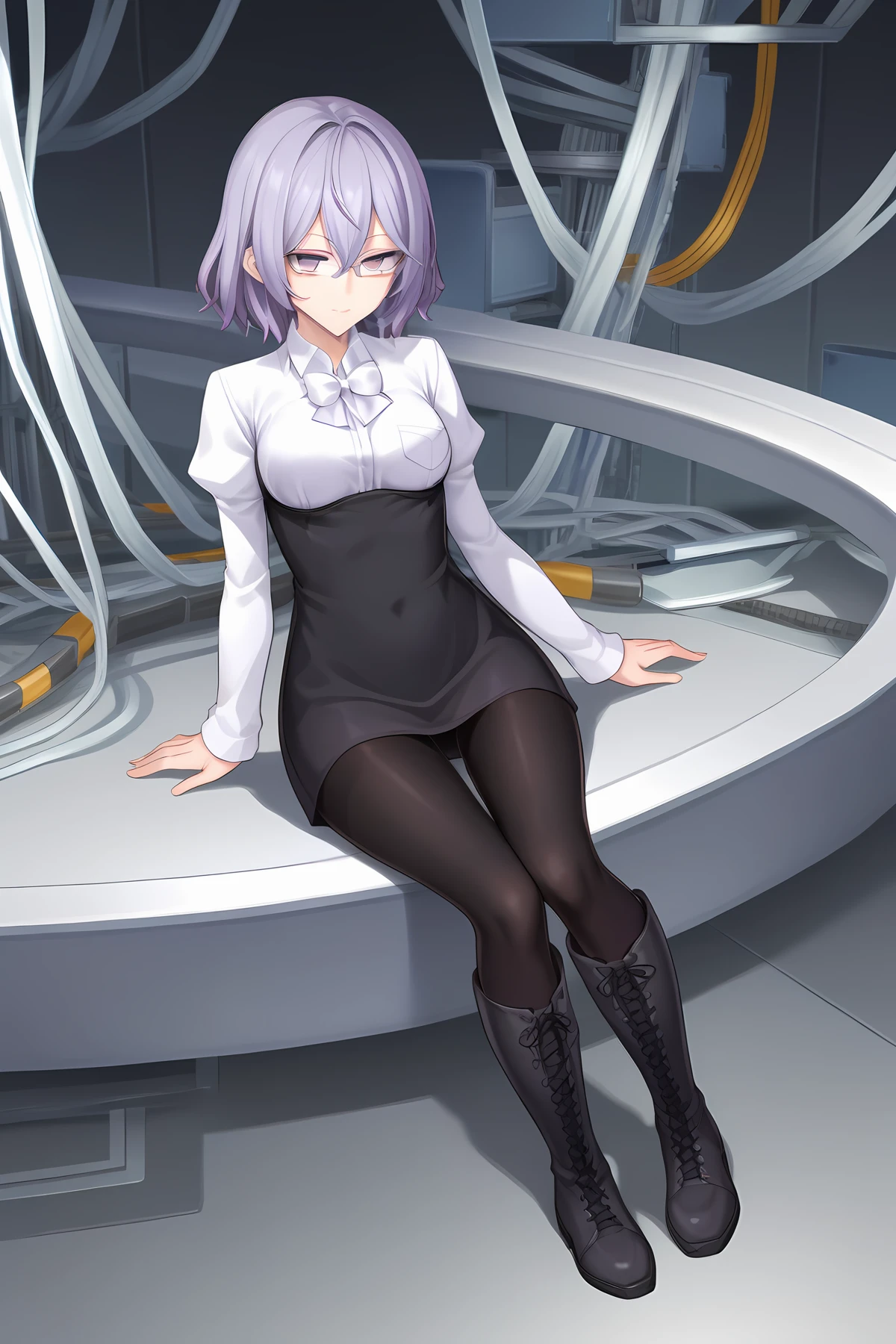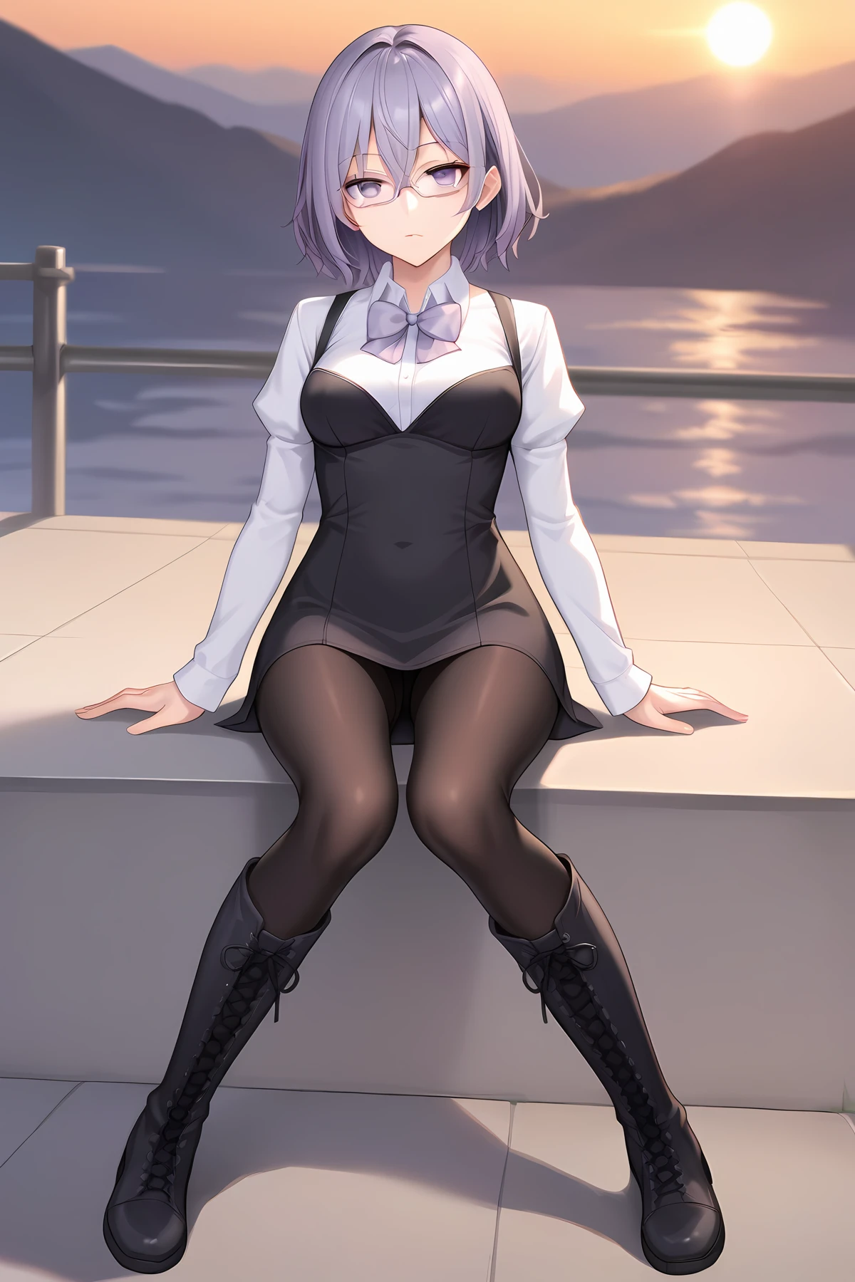 black dress, short dress, white shirt, long sleeves, black pantyhose, white knee boots, bowtie