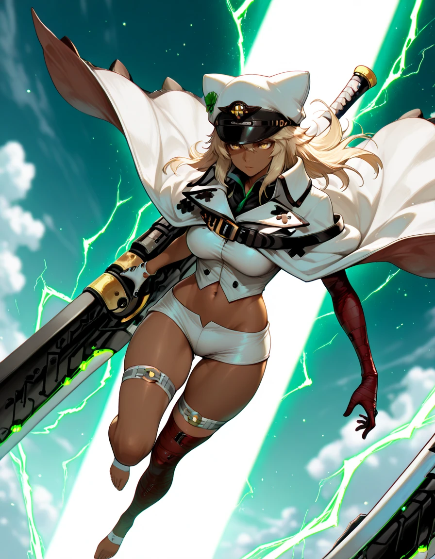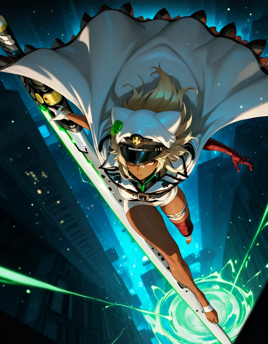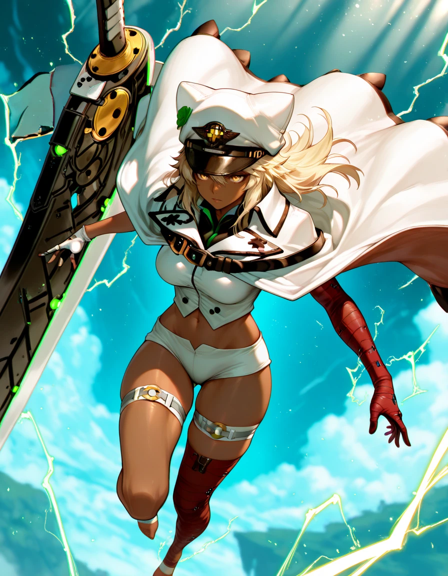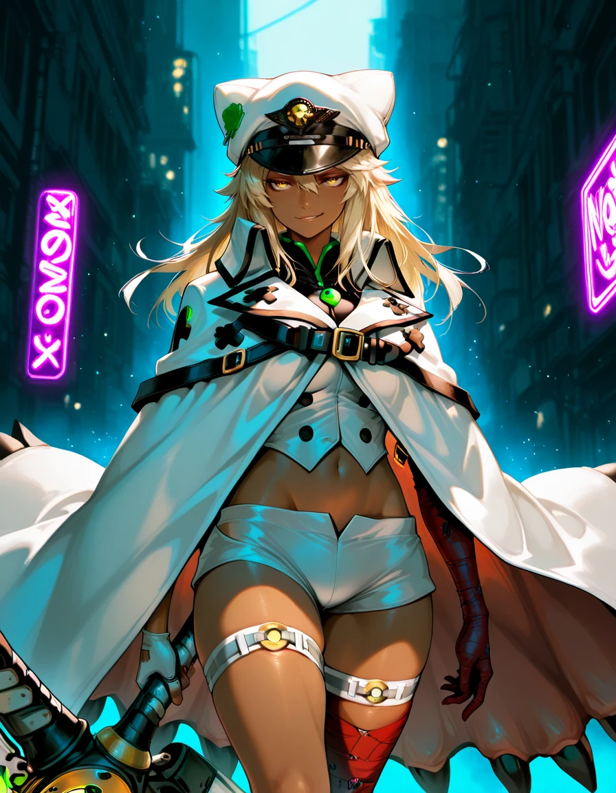 white hat, peaked cap, bandages, cape, asymmetrical legwear, white shorts,
