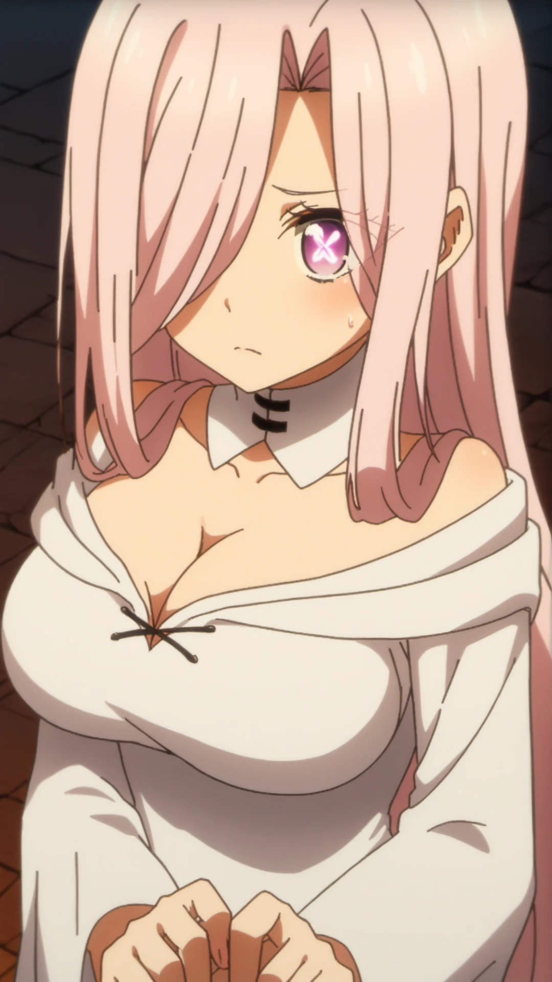 talia_7th_prince, 1girl, bare_shoulders, long hair, purple eyes, sitting, solo_focus, very long hair, flower-shaped_pupils, symbol-shaped pupils
