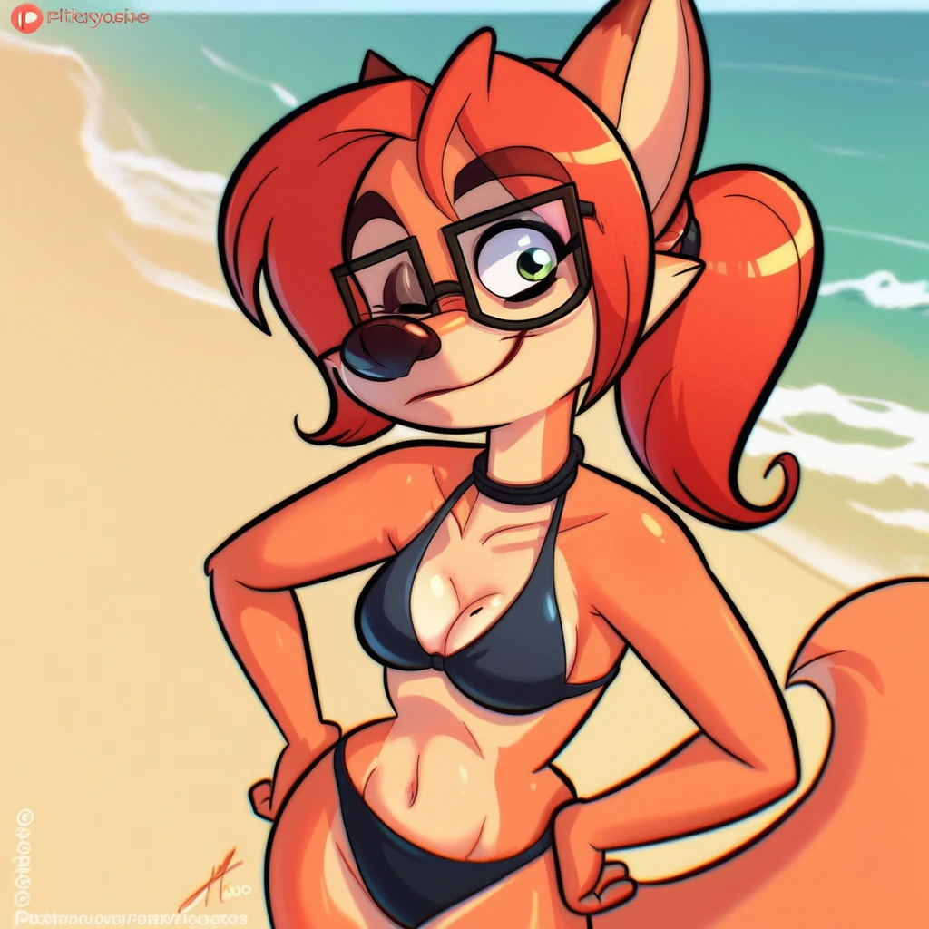 green eyes, orange hair, long hair, ponytail, fluffy tail