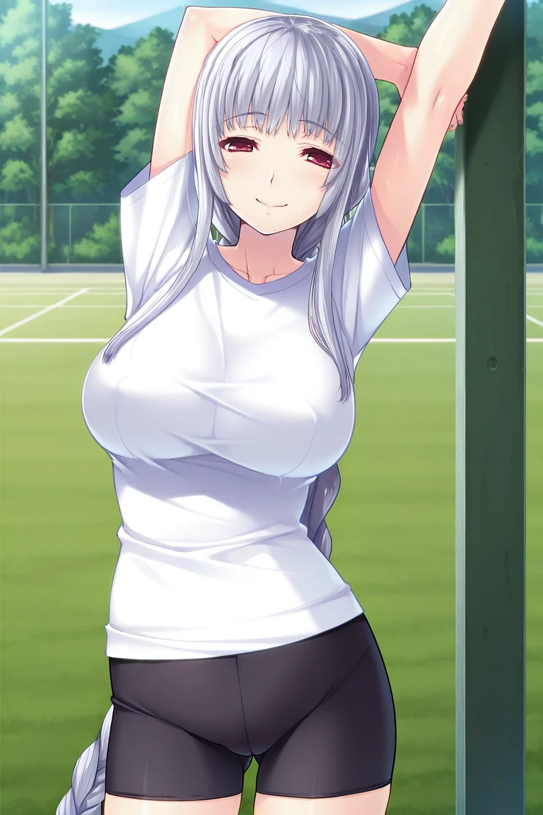 sayoko-training, braided ponytail,white t-shirt, black spandex shorts, short sleeves,