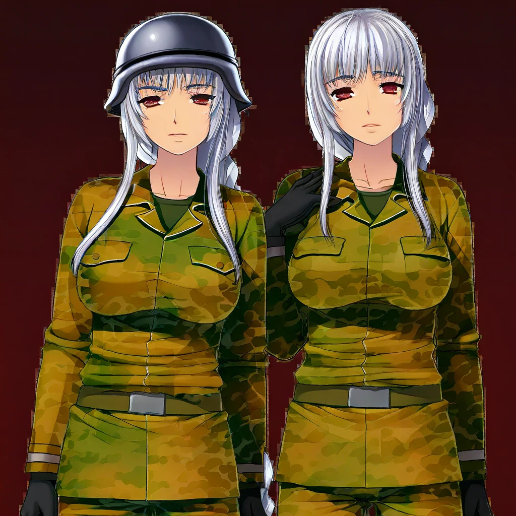 sayako-camo, helmet, braided ponytail, camo shirt, camo pants, belt, black gloves,