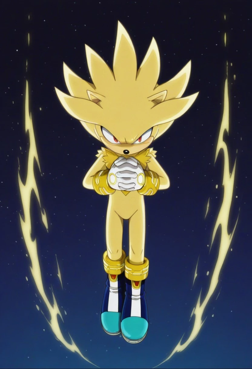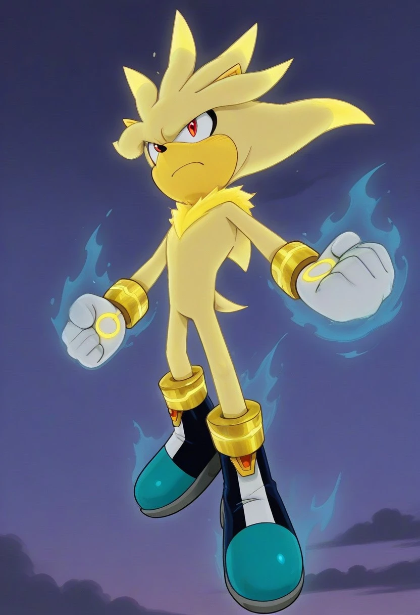 Super Silver, furry, golden fur, red eyes, white gloves with yellow symbol, white and blue shoes