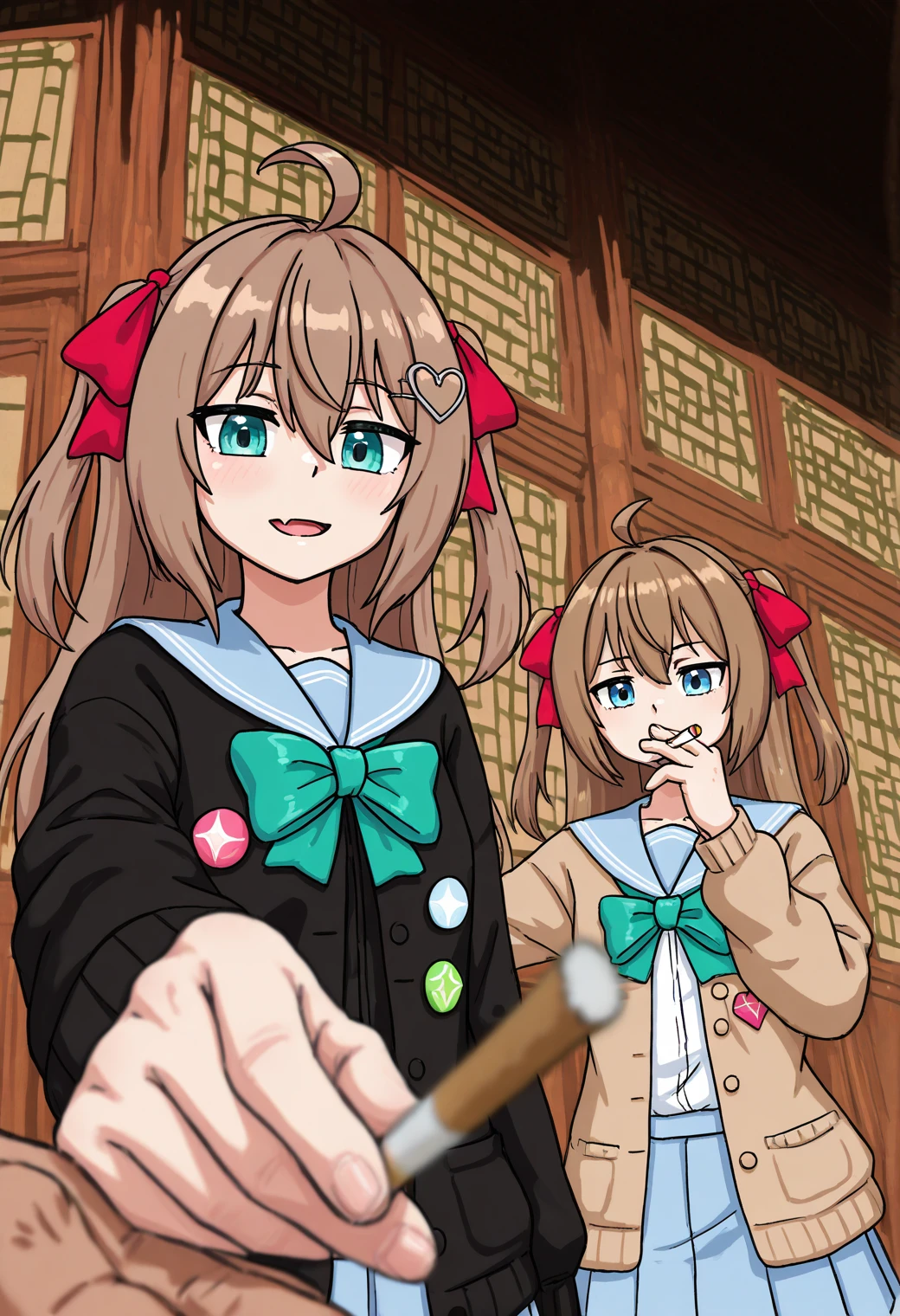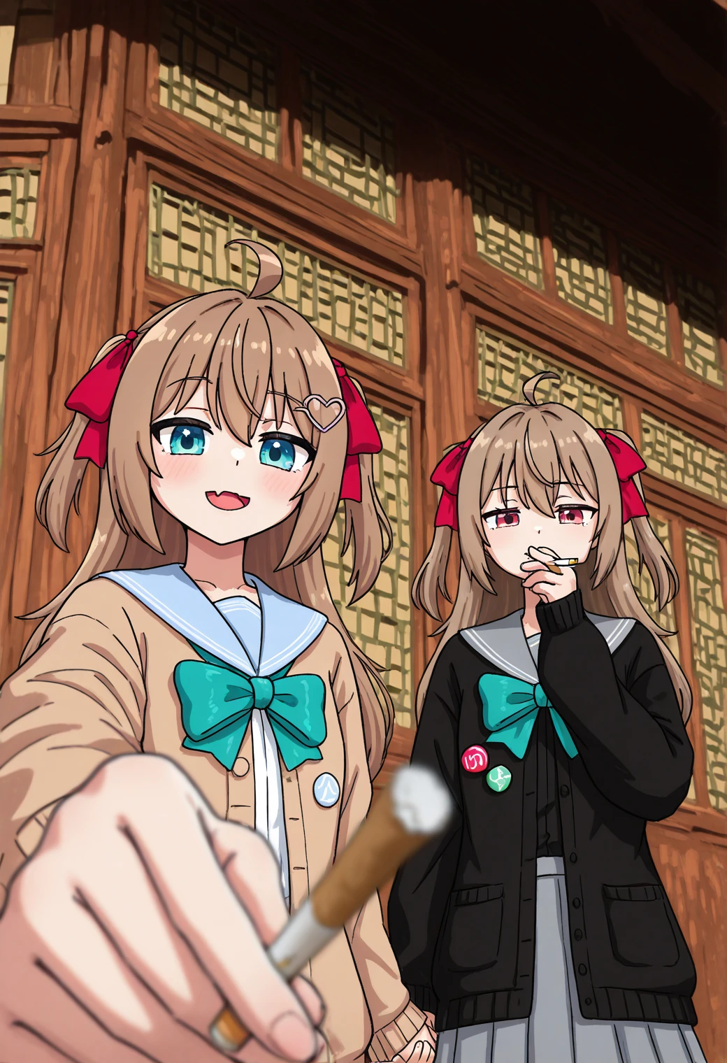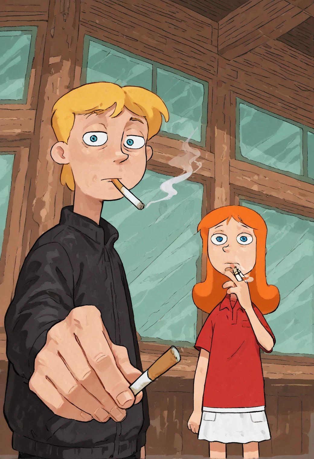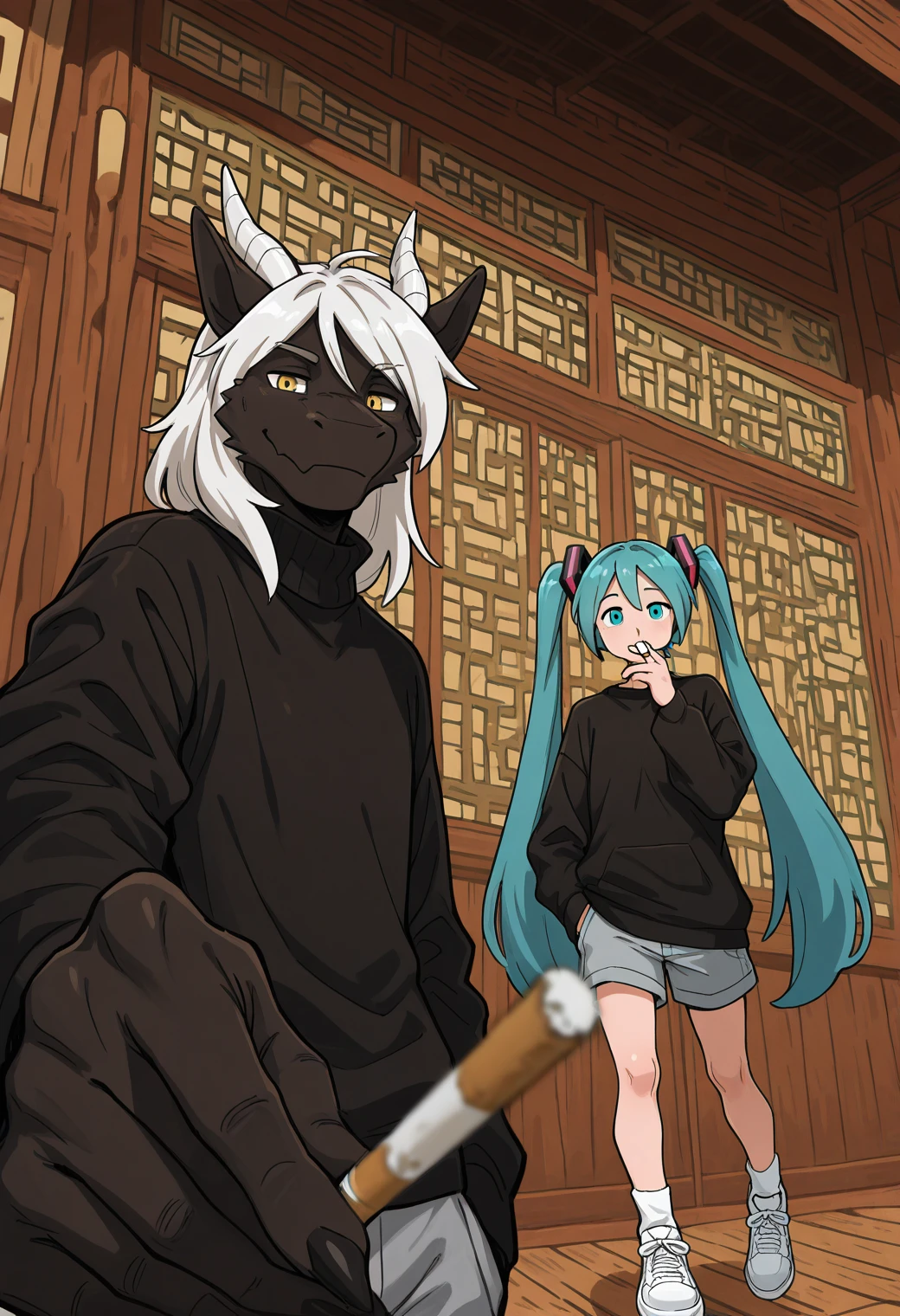 mikus-concept, low angle, street level view, point of view, pov, first-person perspective, holding cigarette, looking at viewer, solo, BREAK, character in foreground, outstretched arm, hand holding cigarette