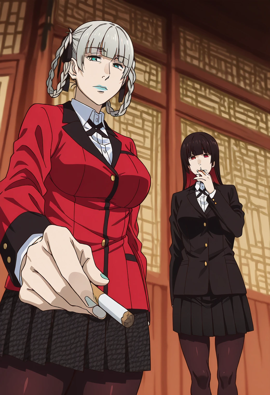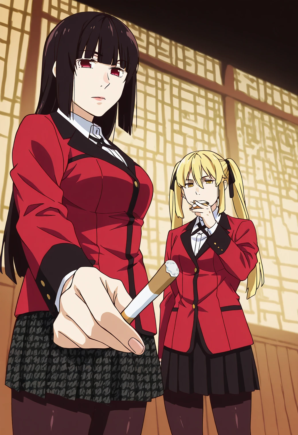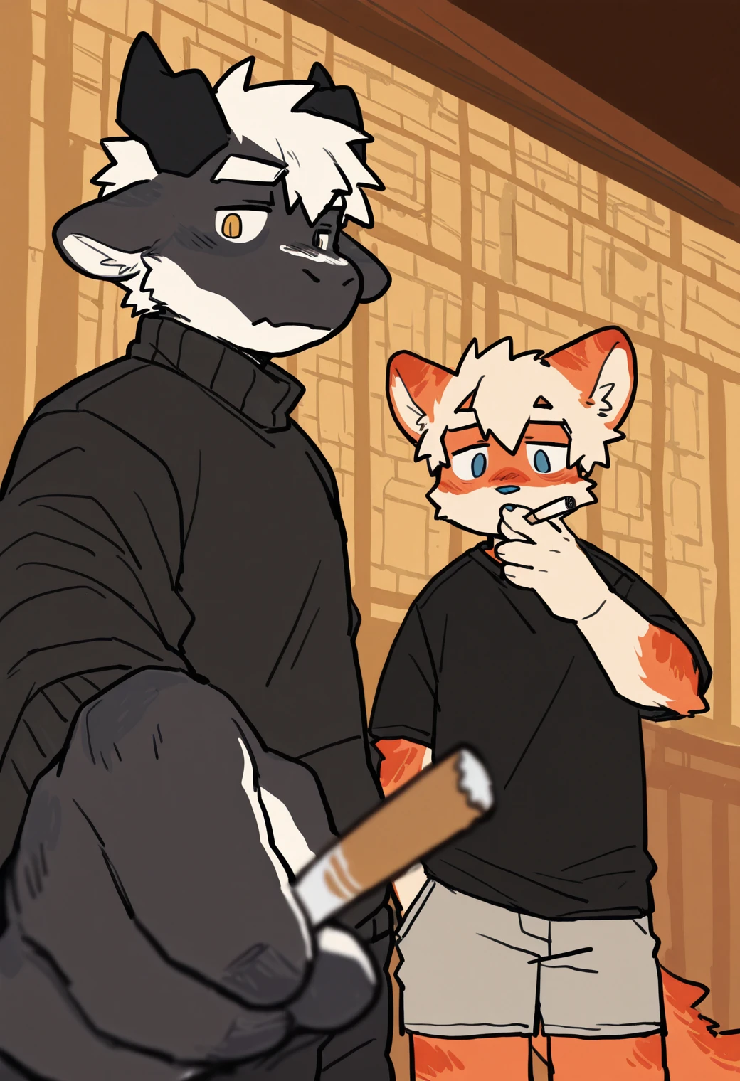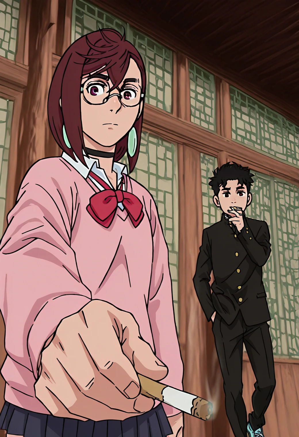 mikus-concept, low angle, street level view, point of view, pov, first-person perspective, holding cigarette, looking at viewer, solo, BREAK, character in foreground, outstretched arm, hand holding cigarette