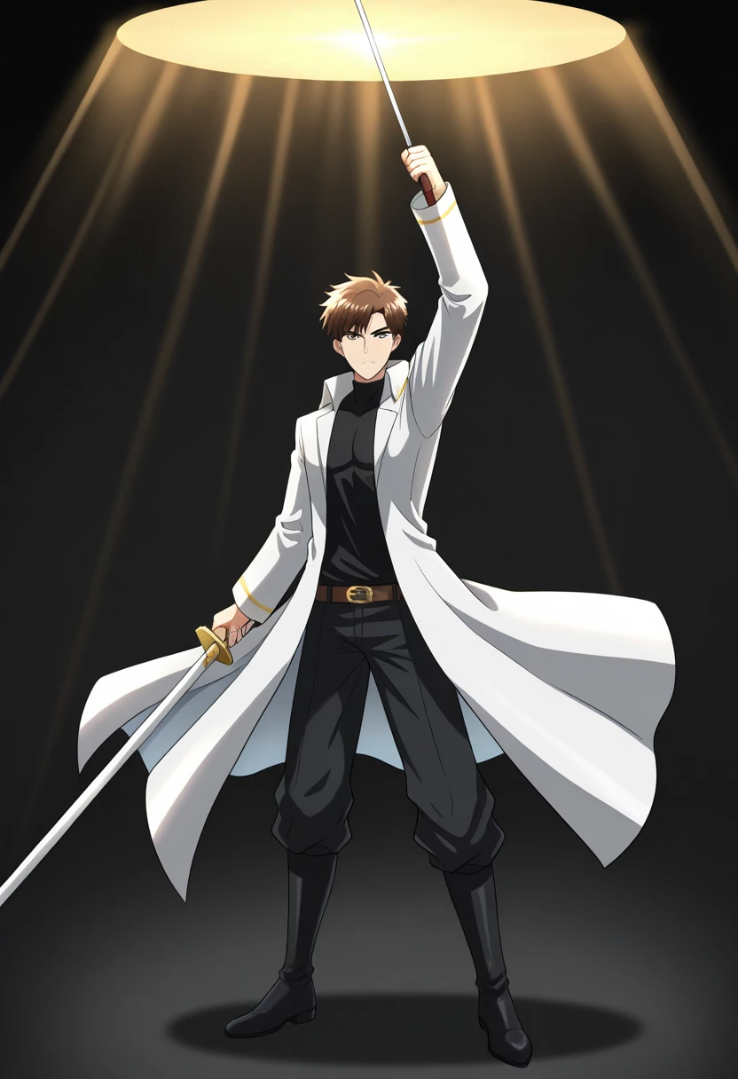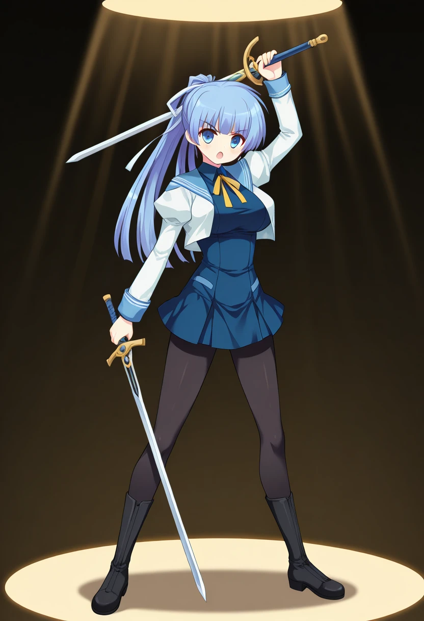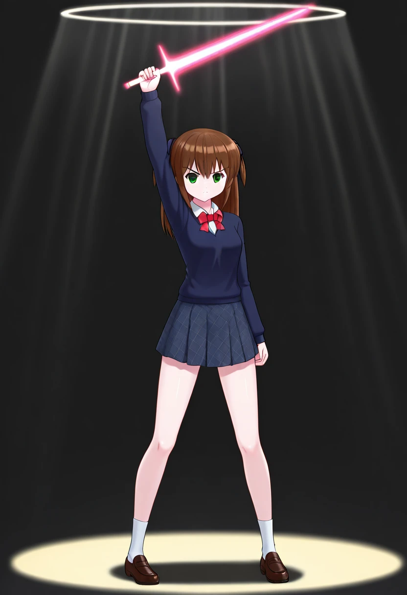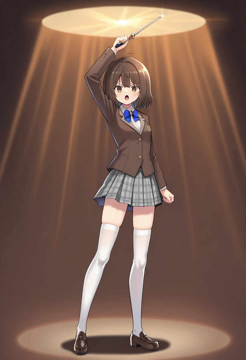 mkaihenshin, holding weapon, arm up, spotlight,