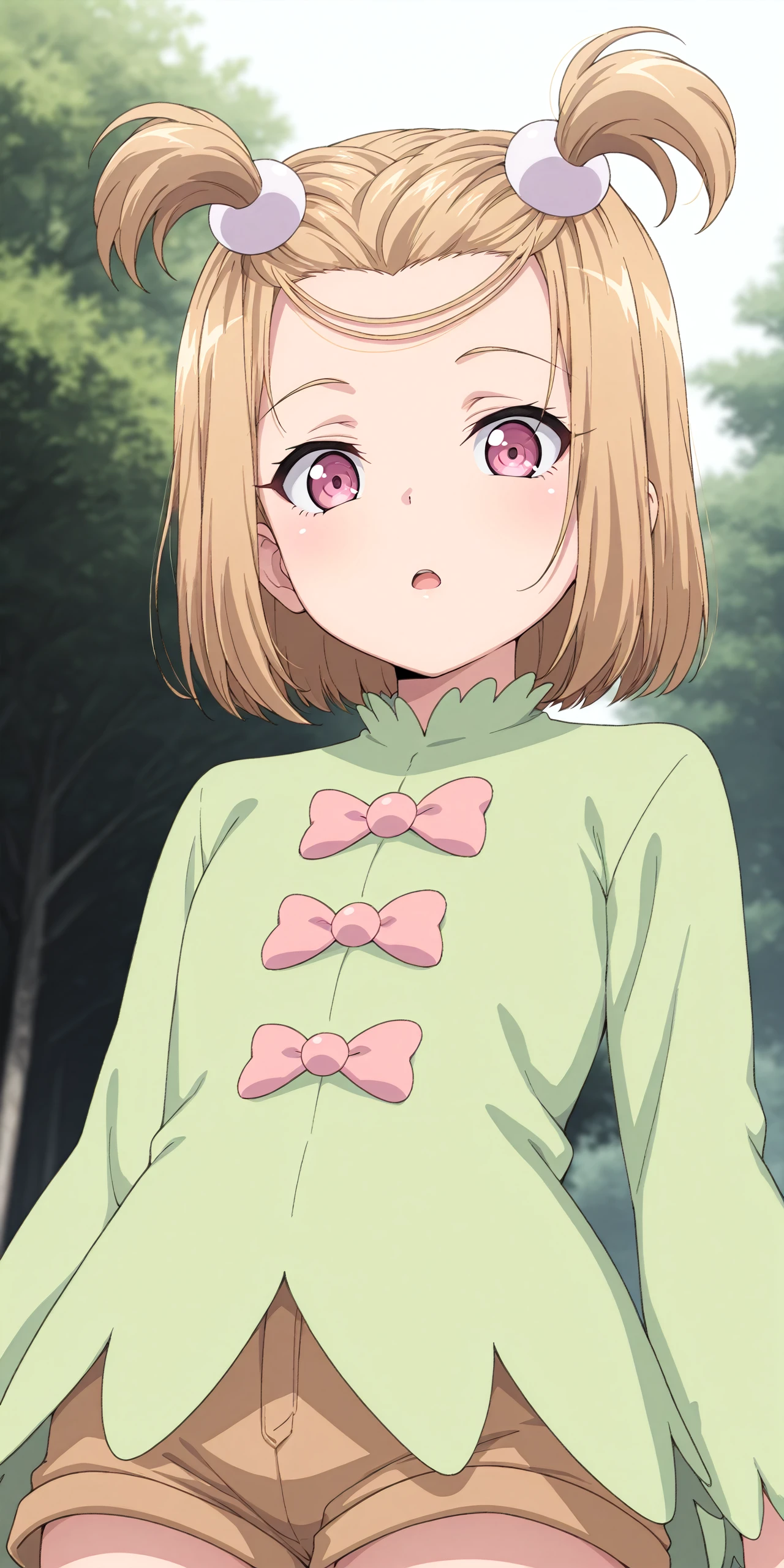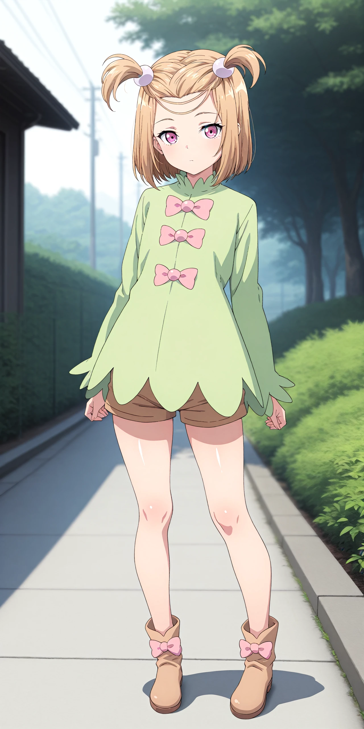 hair ornament,(Nanami Gonomi:0.8),green dress,bow,shorts,expressionless,brown footwear,pink bow,