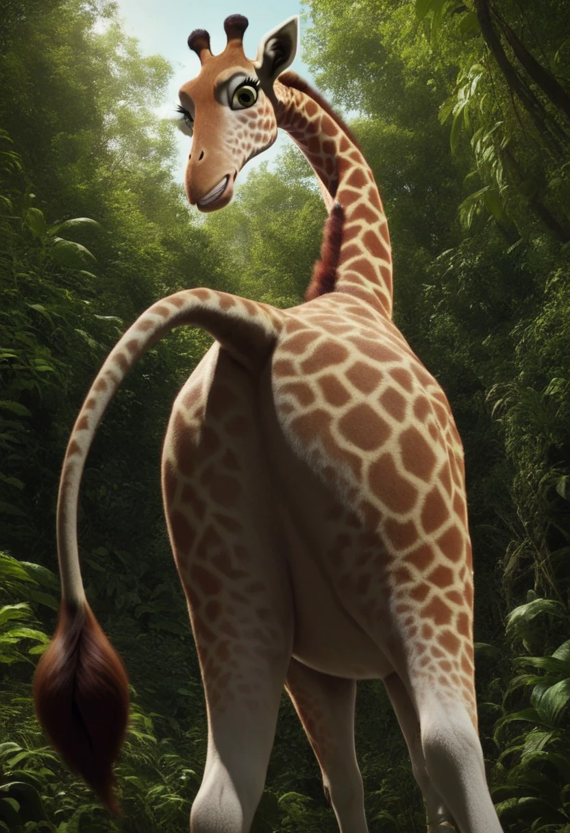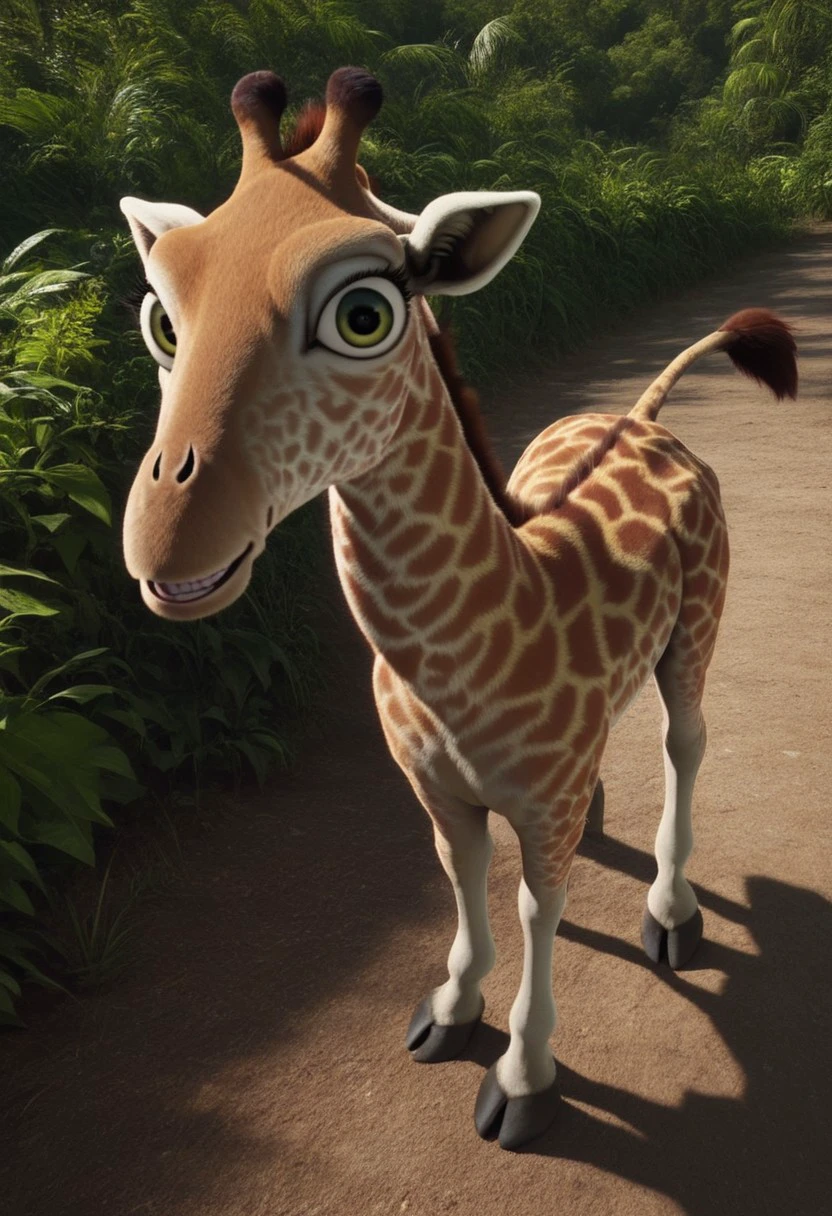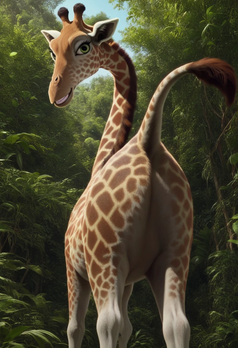 bridget (the wild), 1girl, female giraffe, feral, two-toned fur, cream fur, orange spots, green eyes, eyelashes, long neck, long legs,