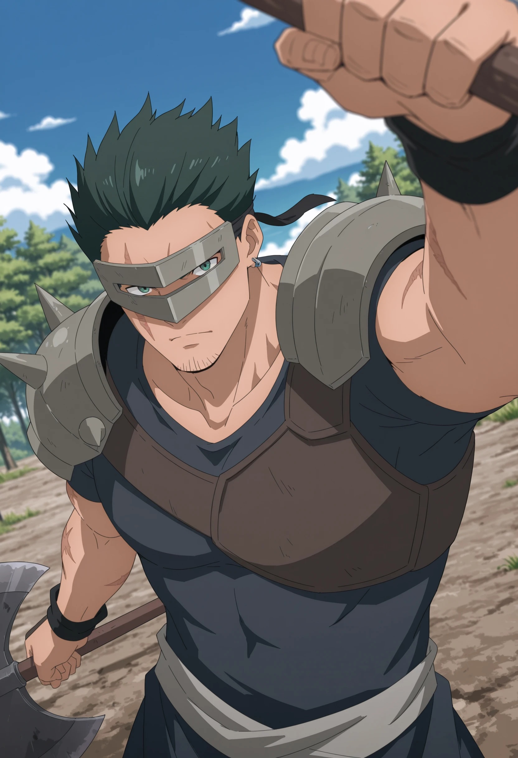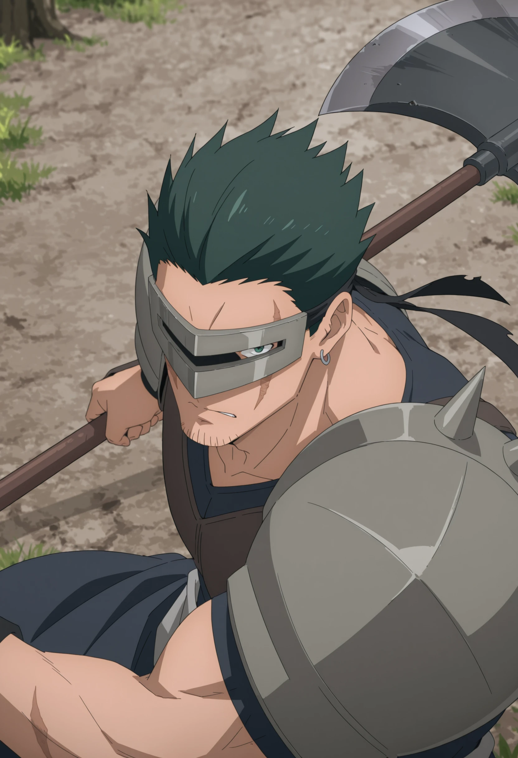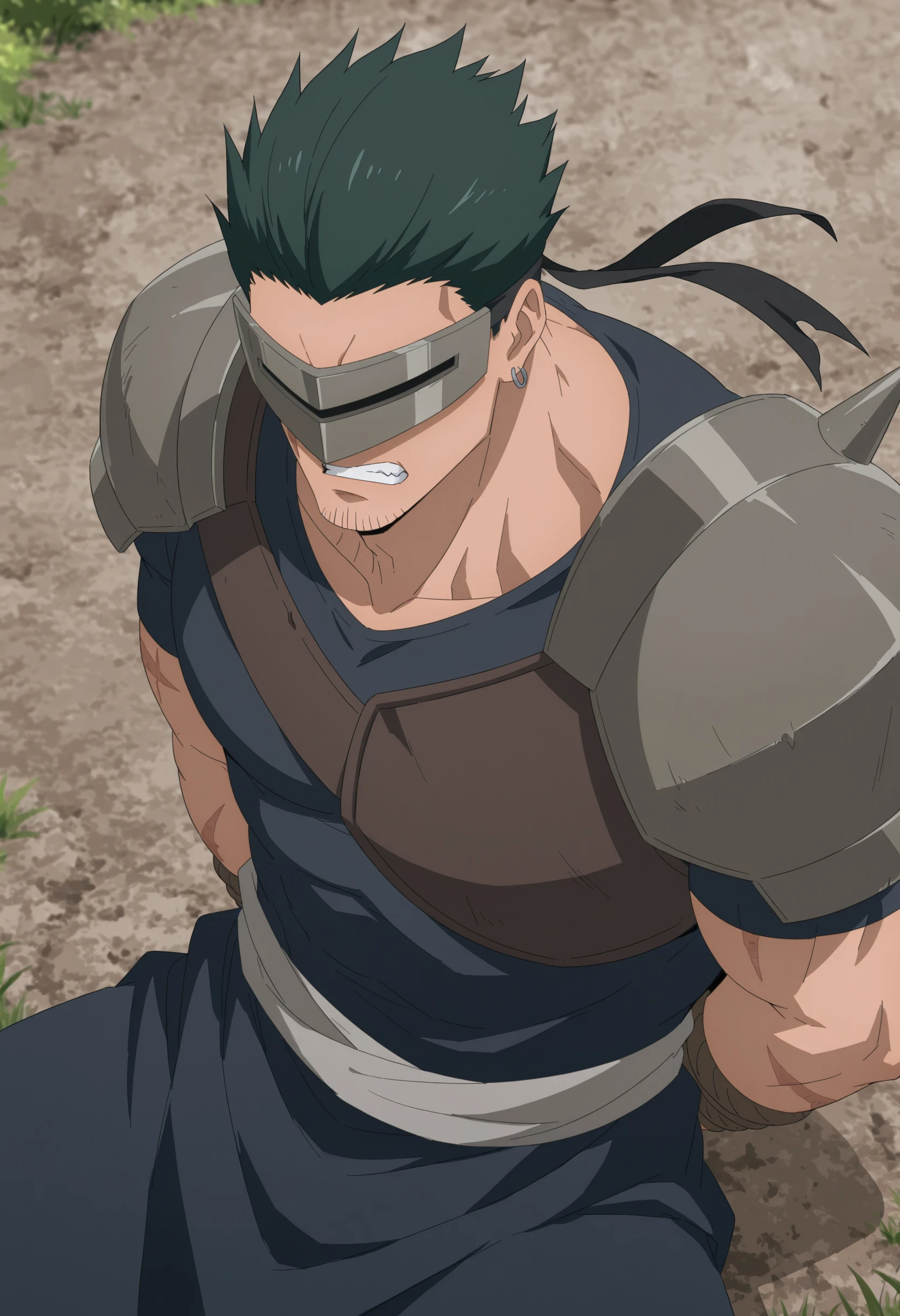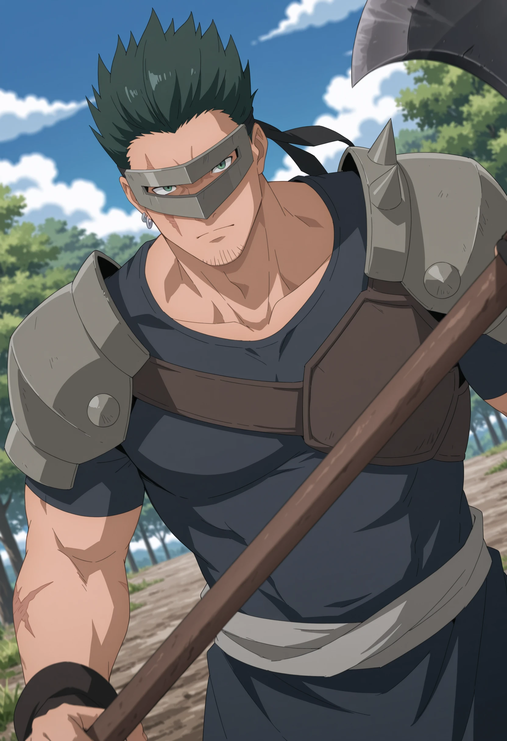green spiky hair, black headband with grey visor, scar on face, gray armored shoulder pads with spike, dark blue tunic, stubble on chin, earrings, brown chest armor