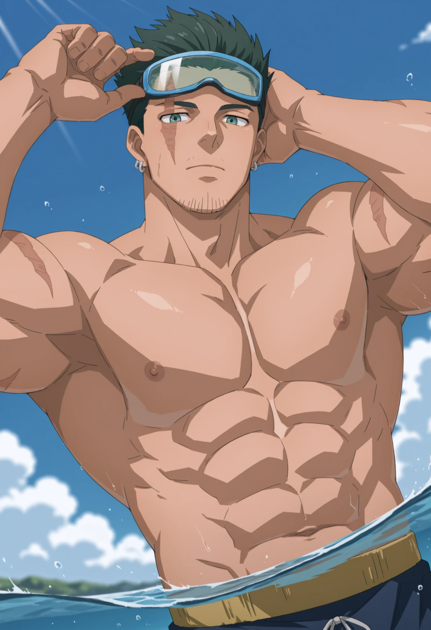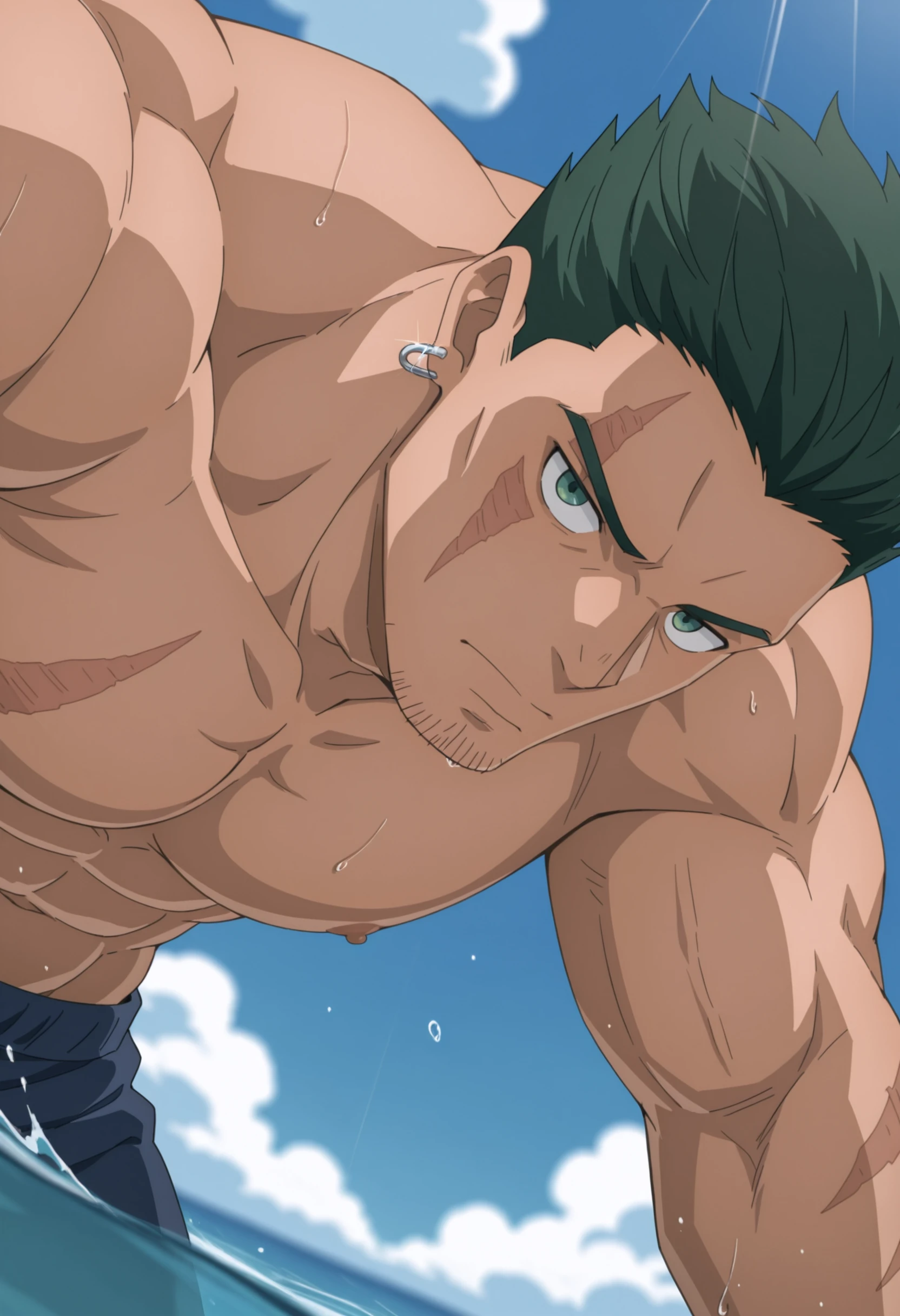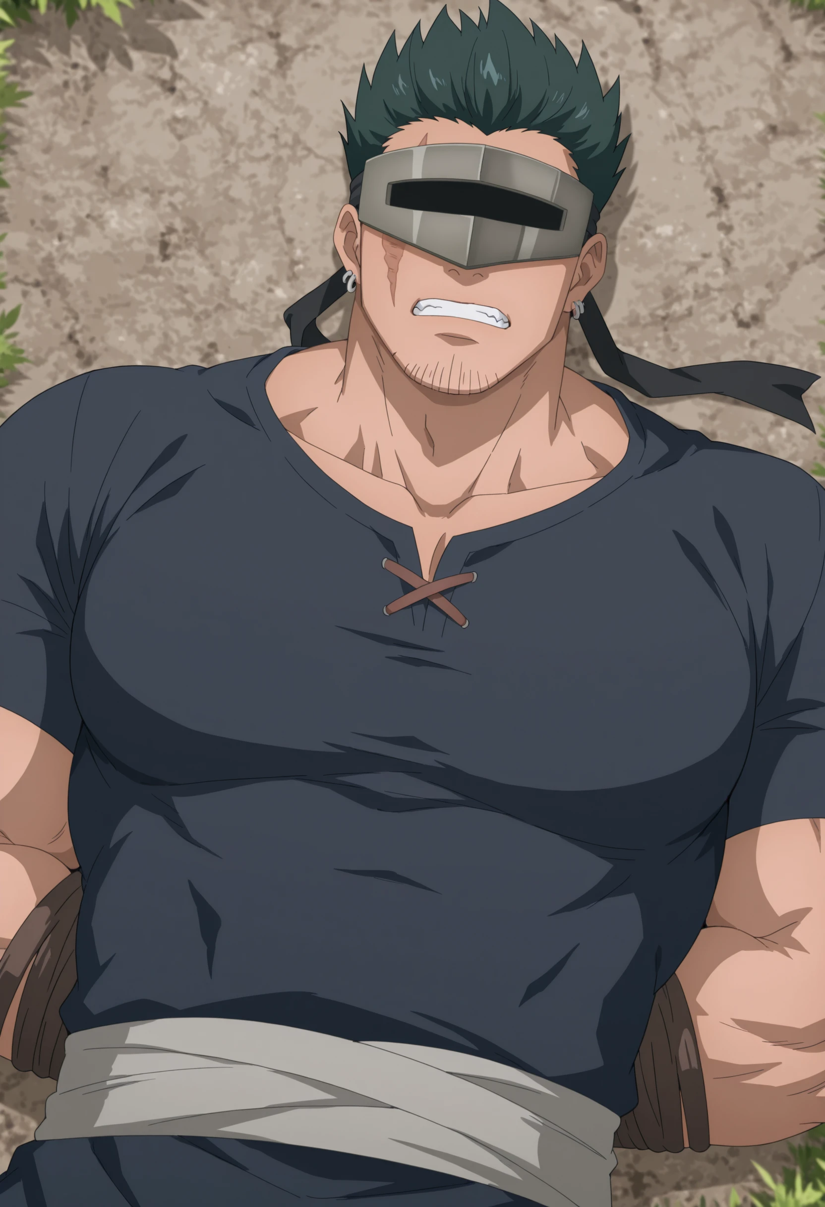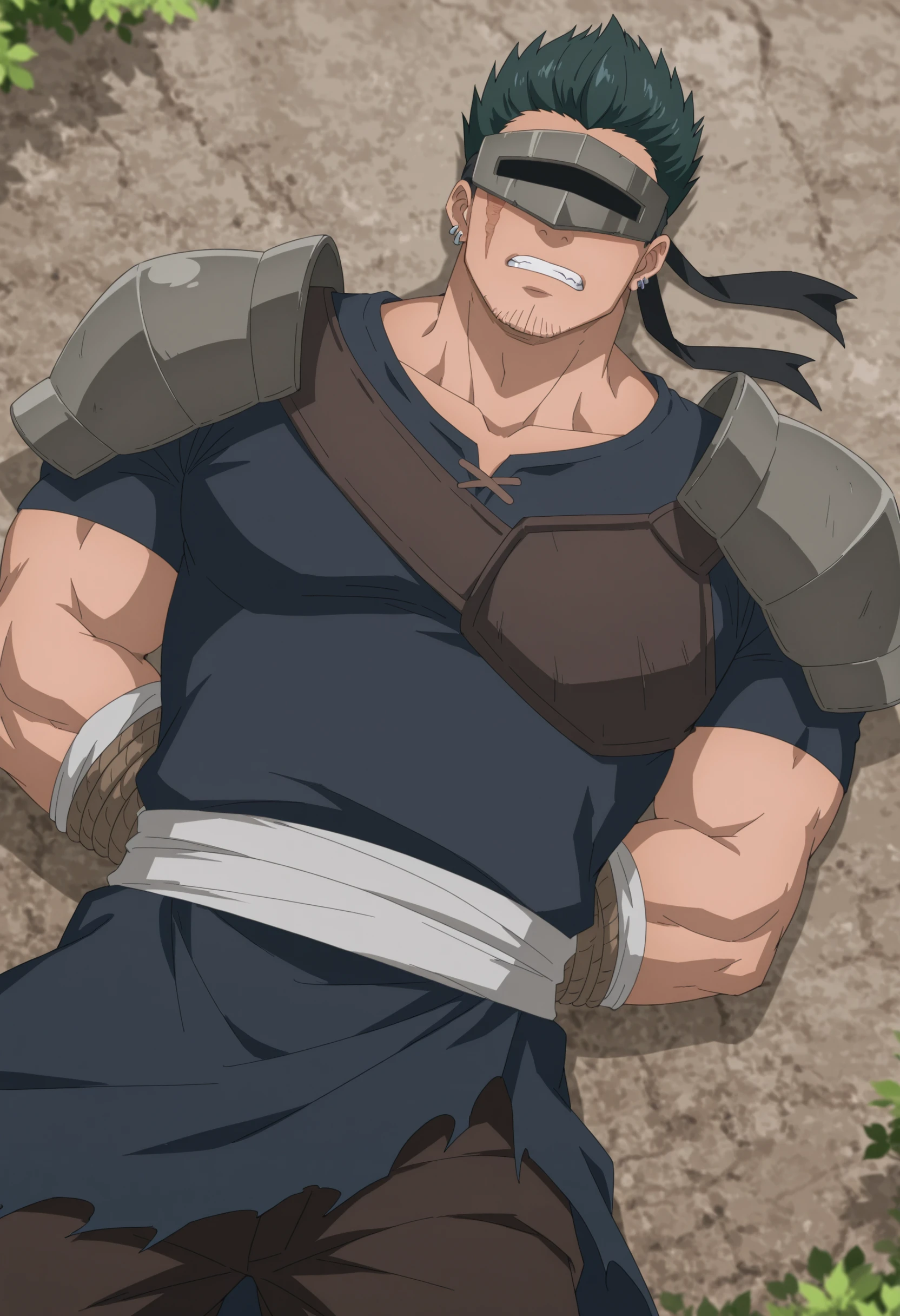 green spiky hair, black headband with grey visor, scar on face, gray armored shoulder pads with spike, dark blue tunic, stubble on chin, earrings, brown chest armor