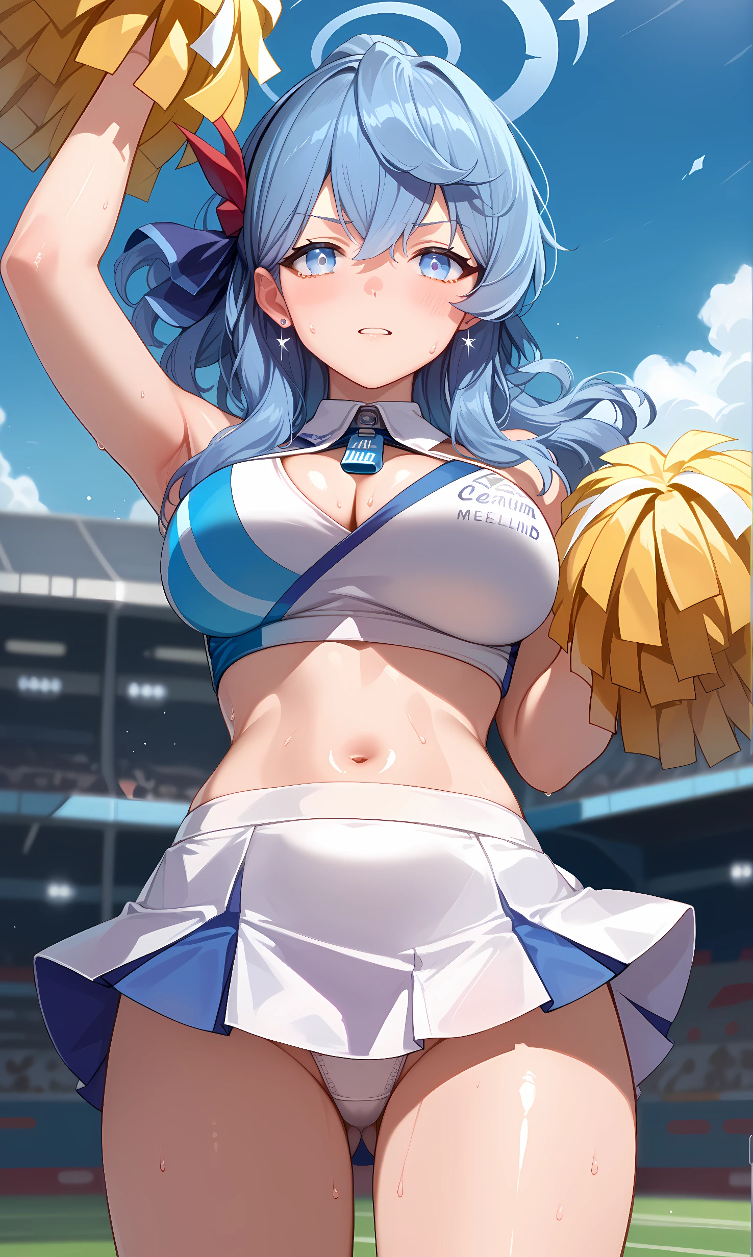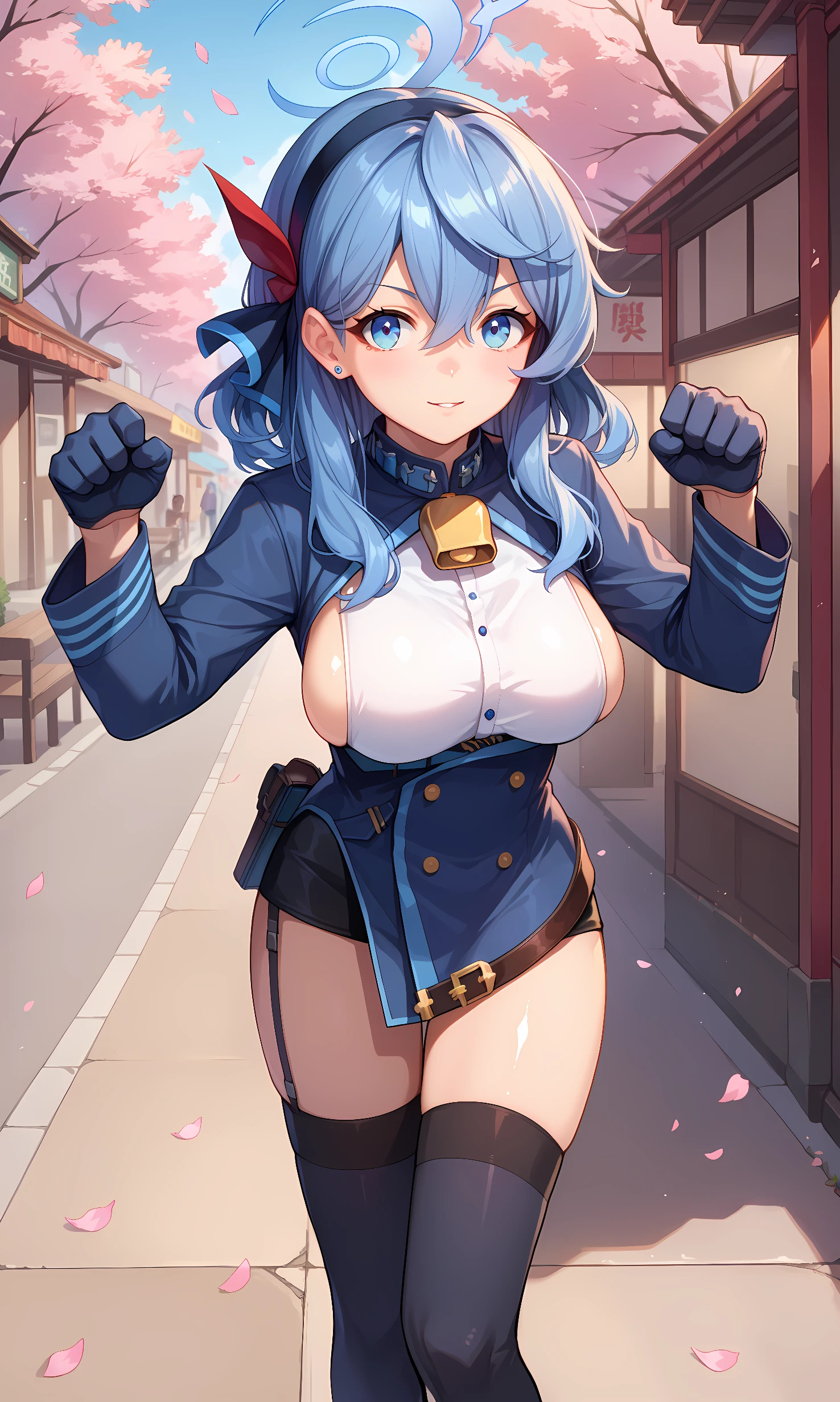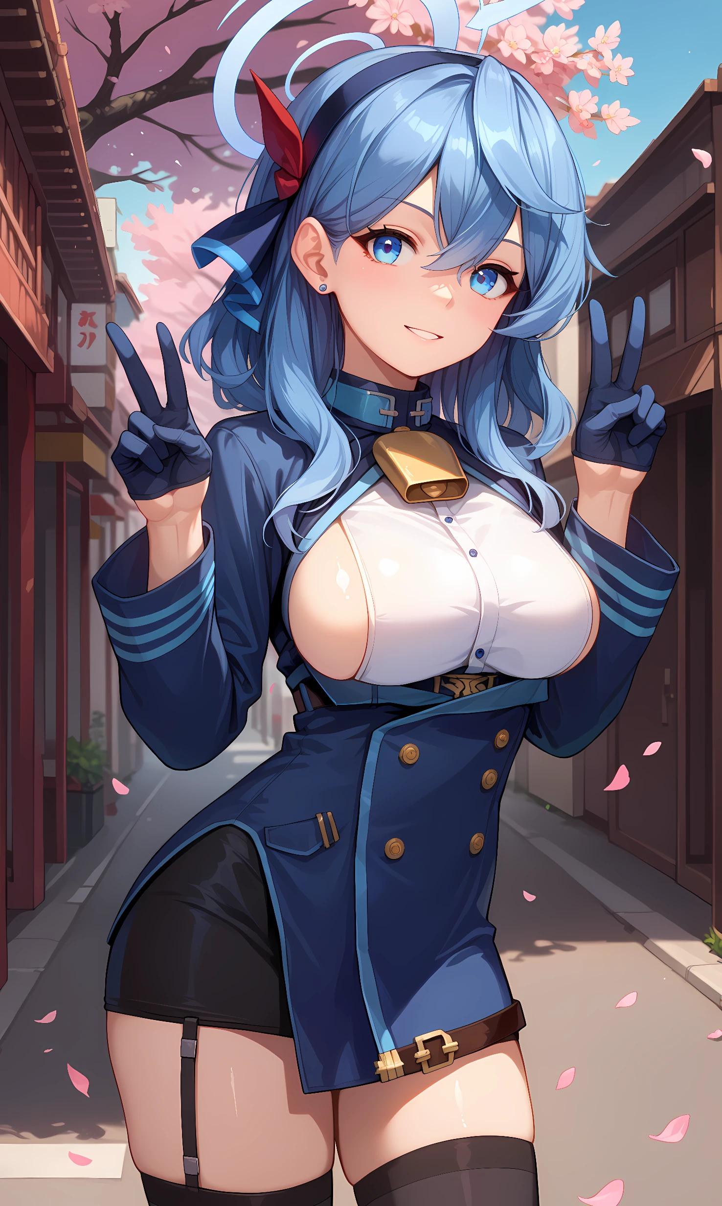 neck bell, sideless outfit, sideboob, black skirt, garter straps, black thighhighs, white shirt, black gloves, half gloves, blue jacket, long sleeves, blue gloves, black footwear