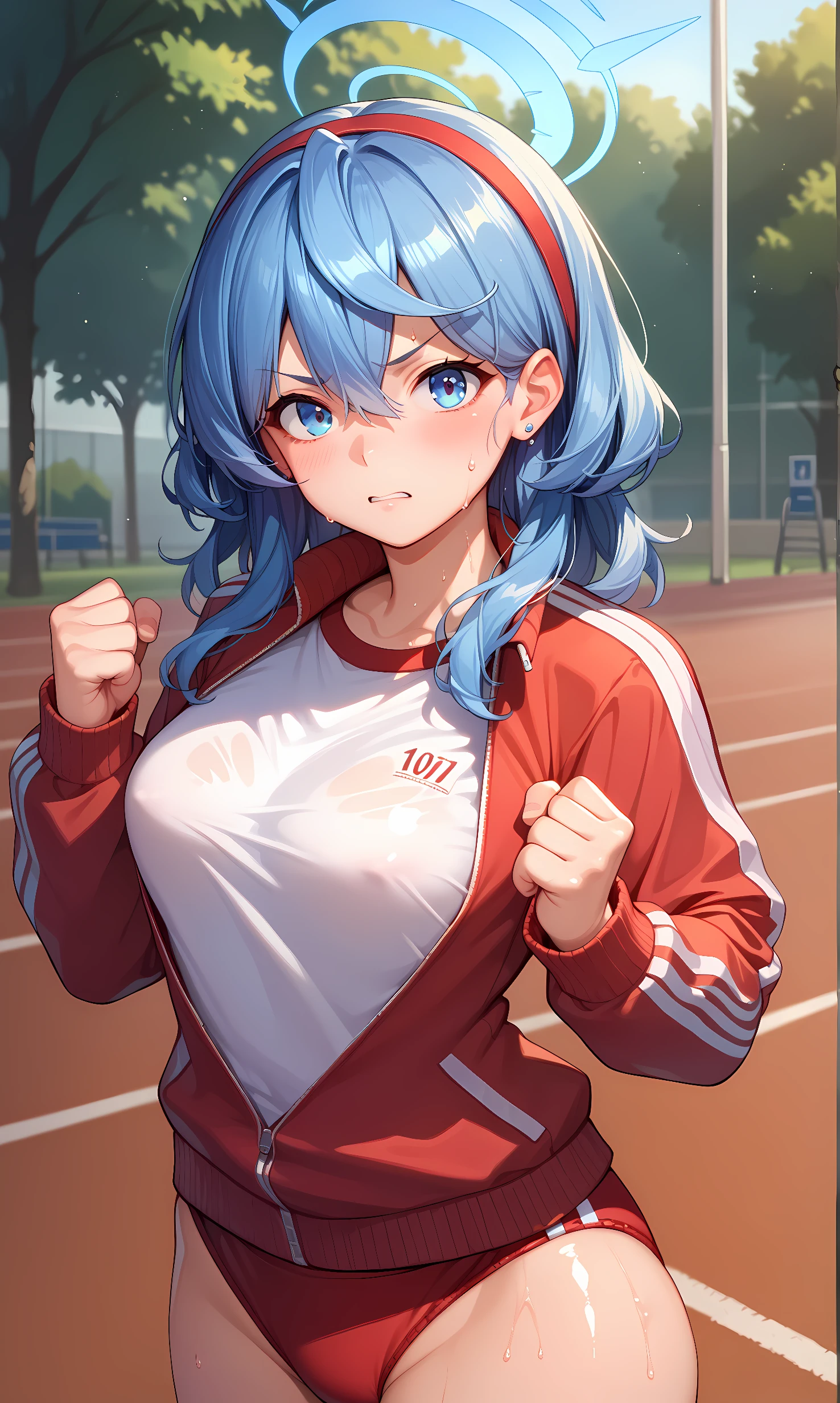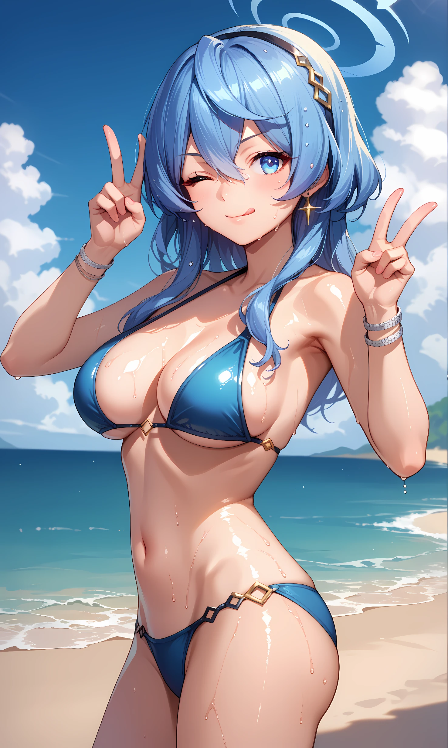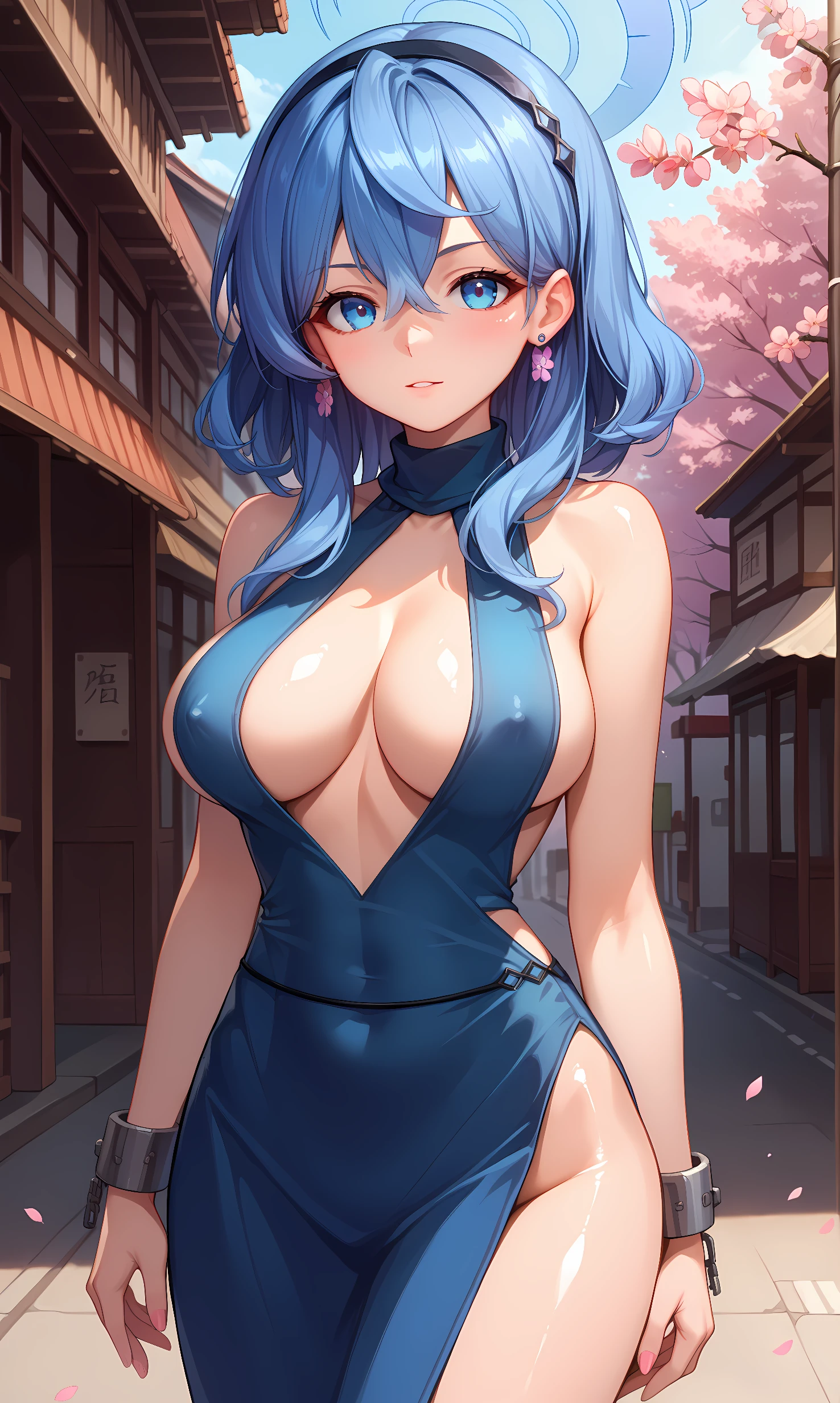 amau_ako, blue eyes, blue hair, long hair, hair between eyes, hair ornament, hairband, stud earrings, halo