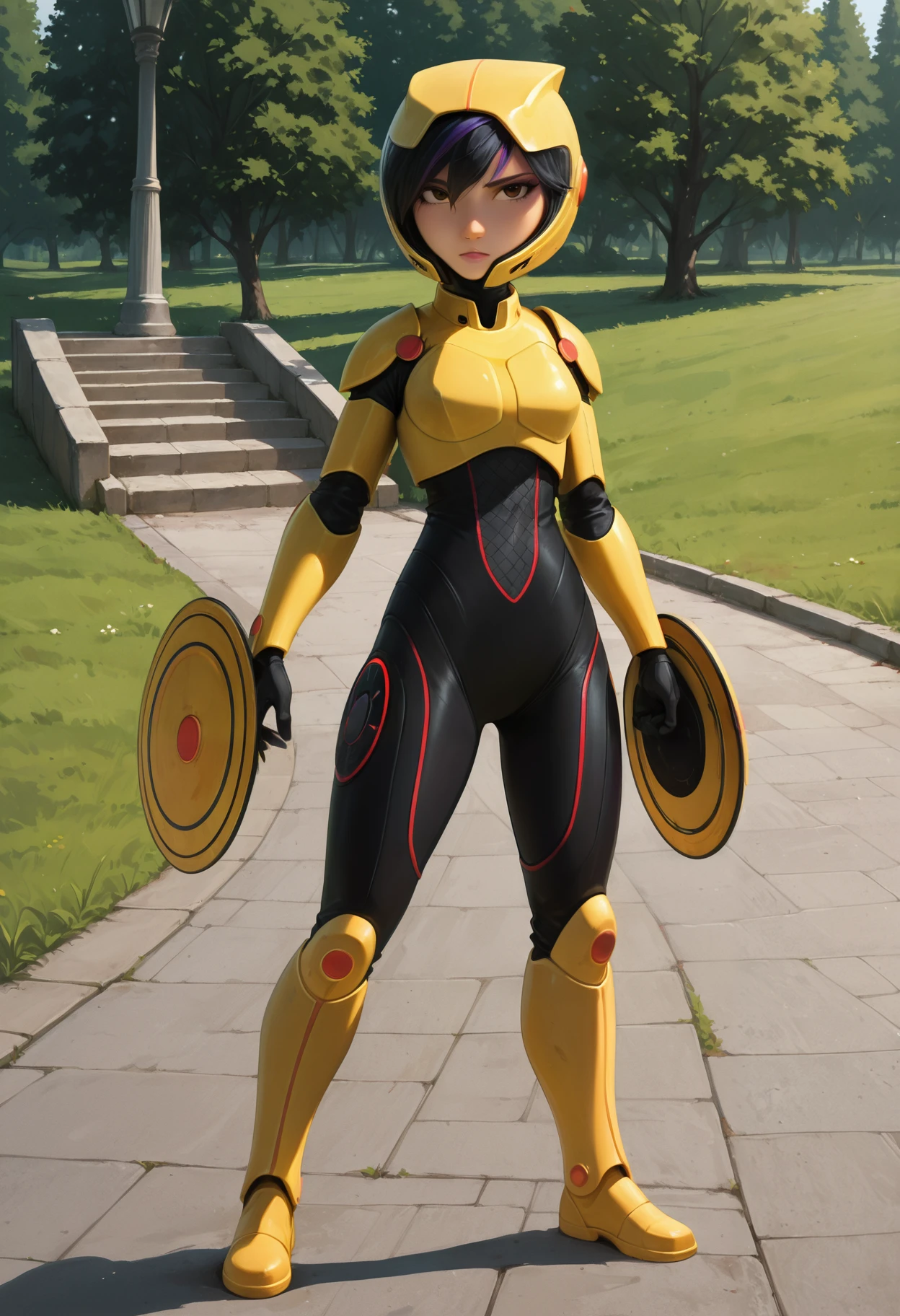 gogotomago-hero, bodysuit, black bodysuit, yellow armor, helmet, armor, wheels, disc, yellow wheels, yellow discs