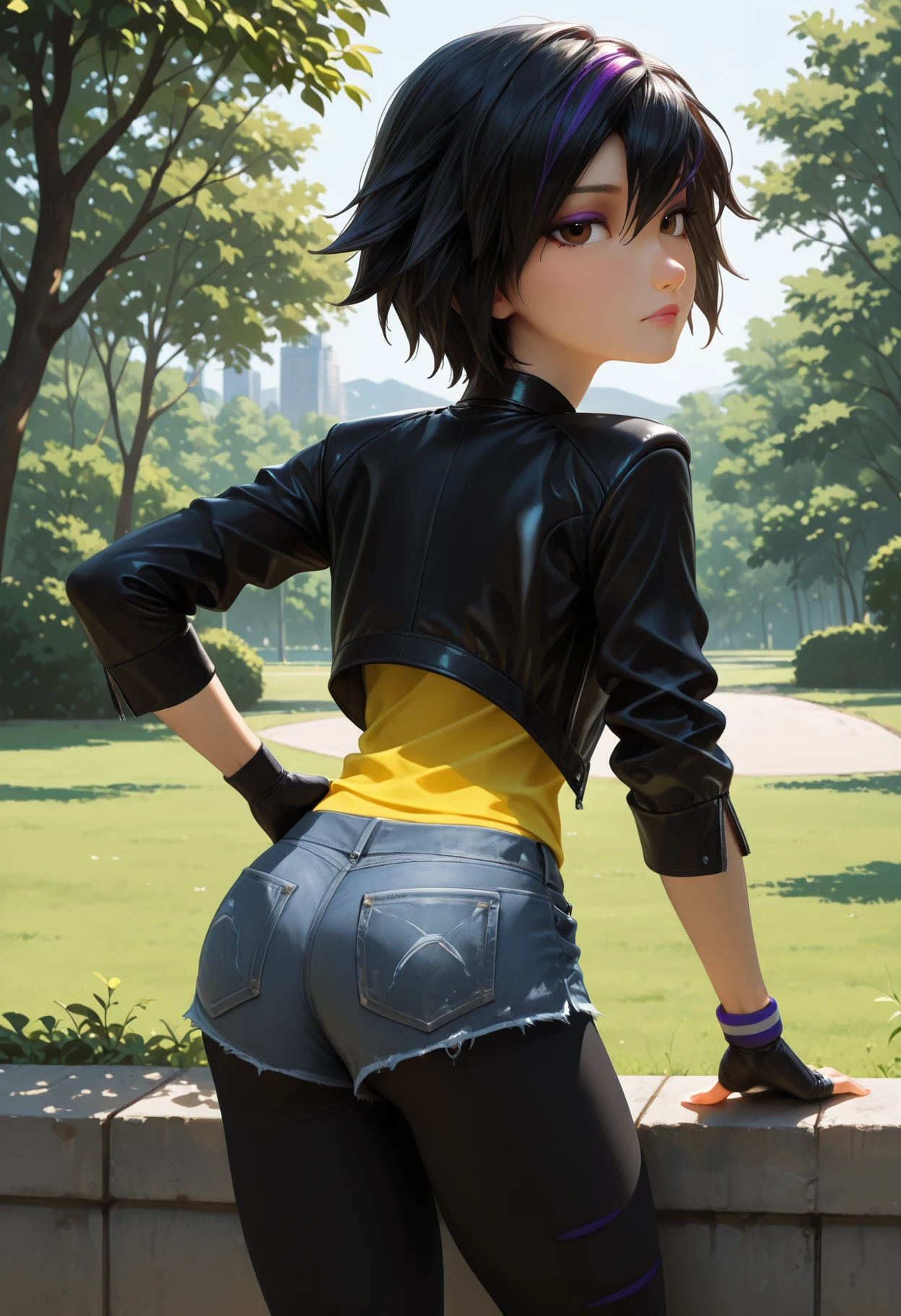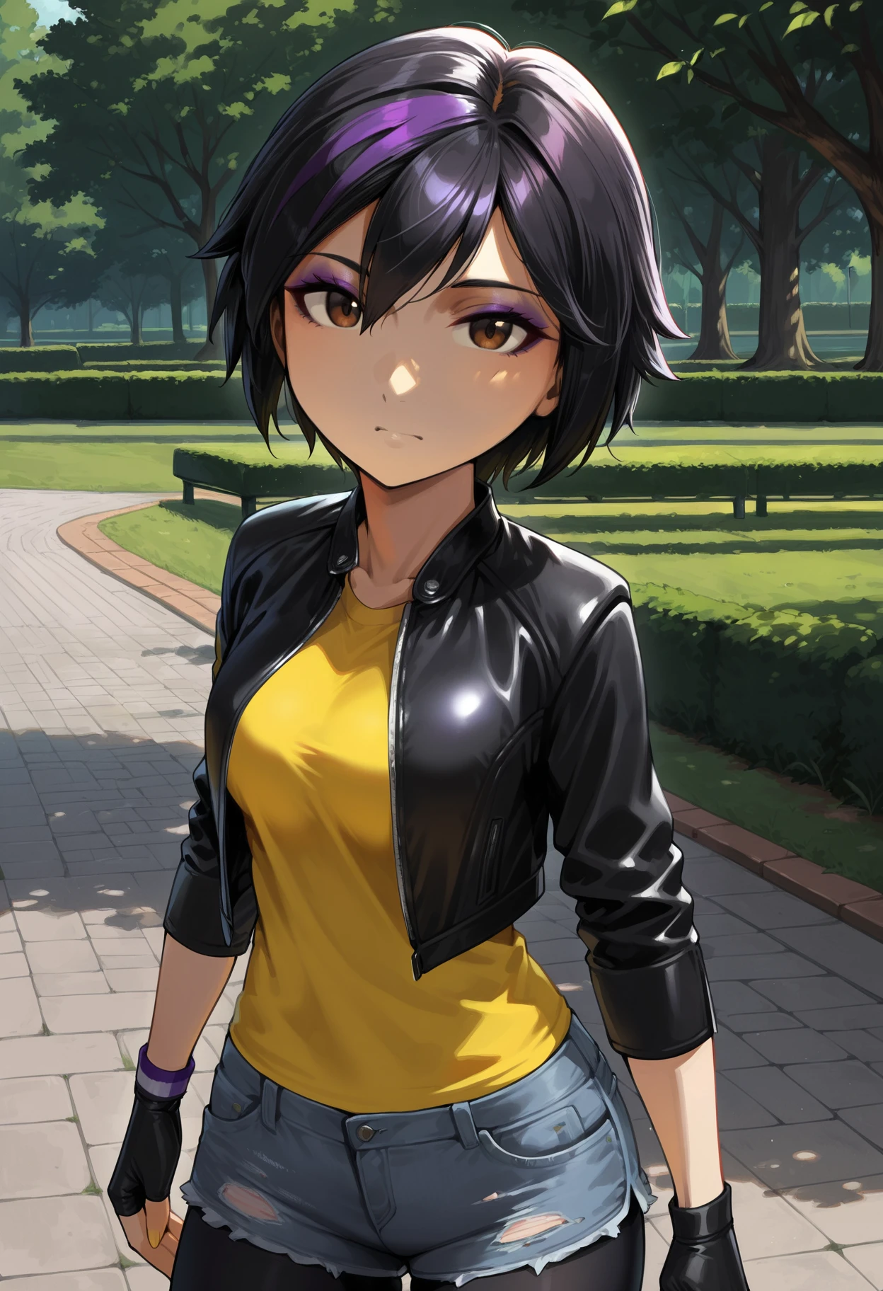 gogotomago-denim, jacket, leather jacket, black jacket, cropped jacket, open jacket, yellow shirt, denim, denim shorts, short shorts, spandex, leggings under shorts, gloves, fingerless gloves,