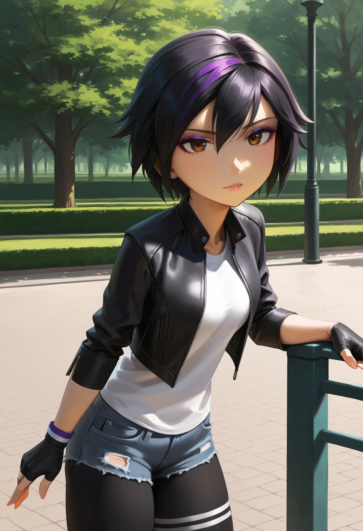 gogotomago, black hair, short hair, multicolored hair, two-tone hair, streaked hair, purple hair, brown eyes, makeup, purple eyeshadow,Casual outfit: