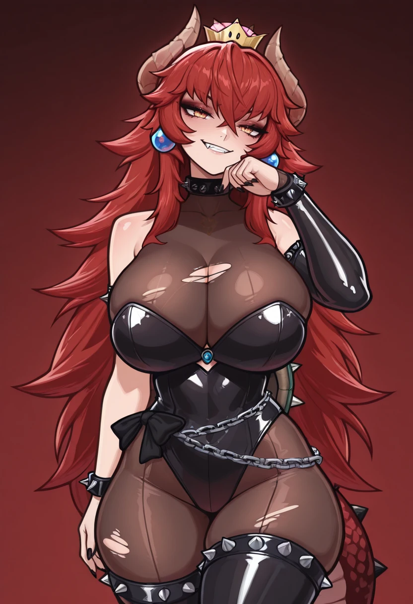 General Appearence Prompt: leotard, black leotard, strapless leotard, armlet, bodysuit, breasts, cleavage, cosplay, dragon tail, red tail, dragon horns, horns, large breasts, spiked armlet, horns, long hair, red hair, red eyes, torn clothes, torn bodysuit, torn clothes, earrings, chain belt, spiked choker, single detached sleeve