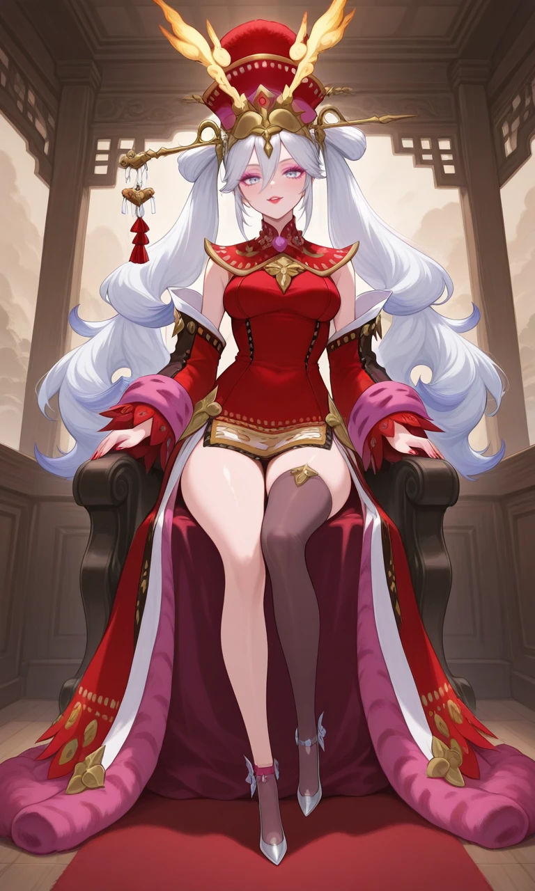 miho(sk), white hair, long twintails, wavy hair, Sky Blue eyes, pink eyeshadow, red lipstick, long nail, Red nail, red hat, gold decorations, chinese hairpin, red dress, Fuchsia robe, black and red stocking, Silver heels,