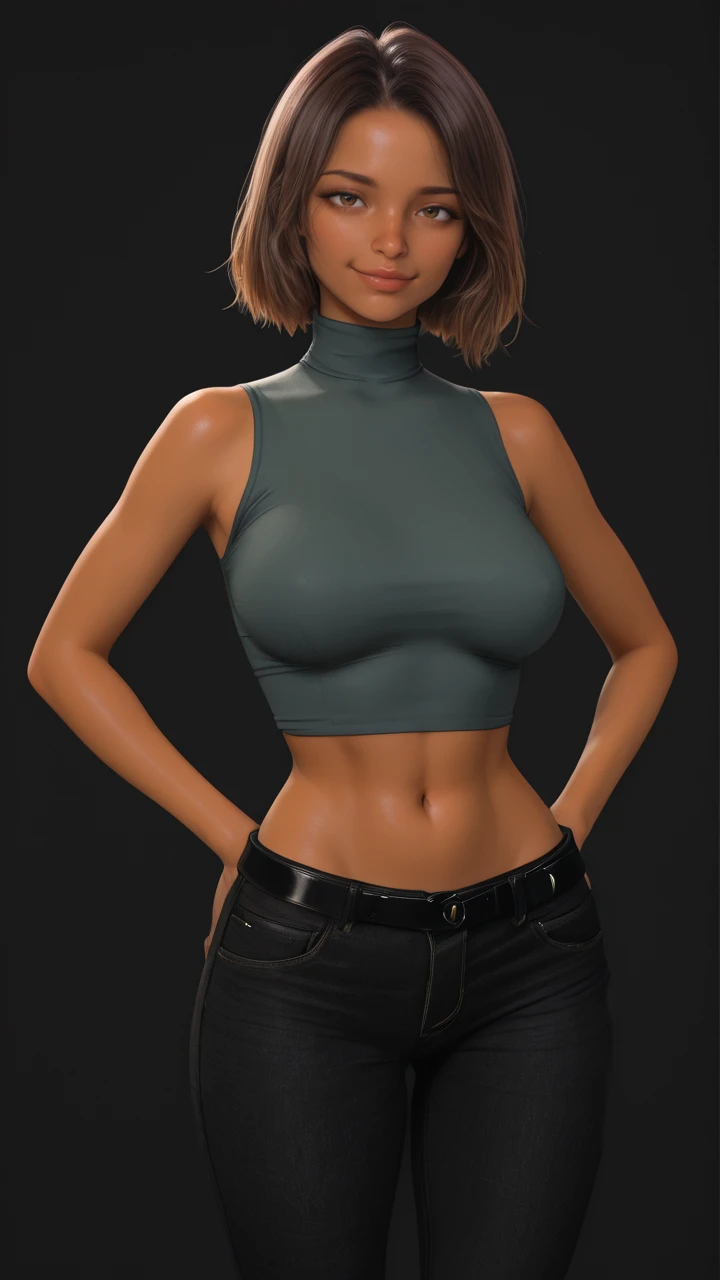 PV_Aliza, brown hair, hazel eyes, dark-skinned female, lips, short hair, swept bangs, medium breasts
